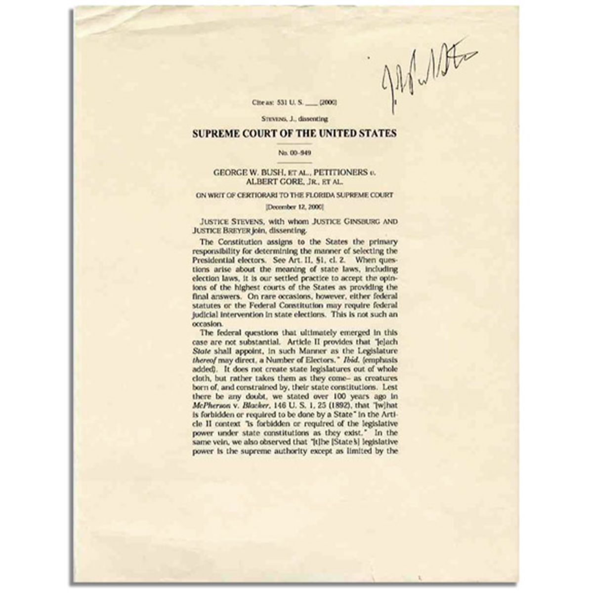 Signed copy of the minority opinion in the U.S. Presidential Election case issued on 12 December 2000 (George W. Bush vs. Albert Gore, Jr.). Signed by Justice John Paul Stevens on title page in black pen. Seven pages on tan paper measure 8.5'' x 11''. A historic item relating to the closest Presidential election in U.S. history. Slight wrinkling to top edge, else fine condition.