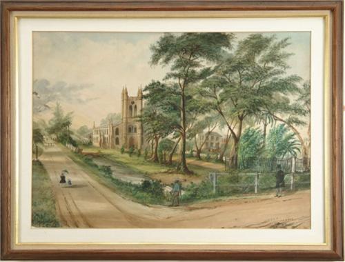 J. P. V. (Mid 19th Century) ENGLISH ABBEY. Watercolor scene shows a large connected church with other buildings and park like setting. The dirt road surrounding has fence beside, a man with saw and axe, mother and daughter and a gentleman with top hat and umbrella. Signed lower right ""JPV 1850in.. Housed in a modern wood linen lined frame with white matte. SIGHT SIZE: 16-3/4in. x 23-1/2in.. CONDITION: An old fold with small tear on right corner side. Otherwise very good. 9-26273