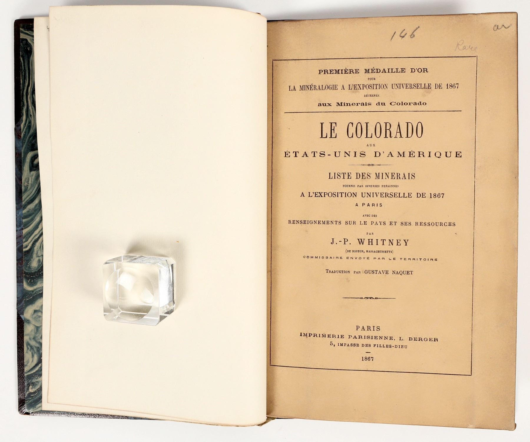 Le Colorado aux Etats-Unis D'Amerique 1867 RARE! Map of Colorado Territory United States. 1867 Re-bound w/ Le Colorado Aux Etats-Unis D'Amerique Listes Des Minerais Fournis Par...L'Exposition Universelle De 1867 "Detailed map of Colorado, one of the earliest published outside the United States. Based largely upon the GLO maps issued in 1865 and 1866. The map and another map of the United States (13.5x7 inches) are bound into this rare exposition pamphlet, likely a promotional piece circulated in Paris during the 1867 Exposition. The work would appear to have been translated from an equally rare English edition, published in the same year (Howes 387). This edition is unrecorded and neither edition appears in Phillips." Ref: Barry Lawrence Ruderman Antique Maps, Inc. See photos for condition.