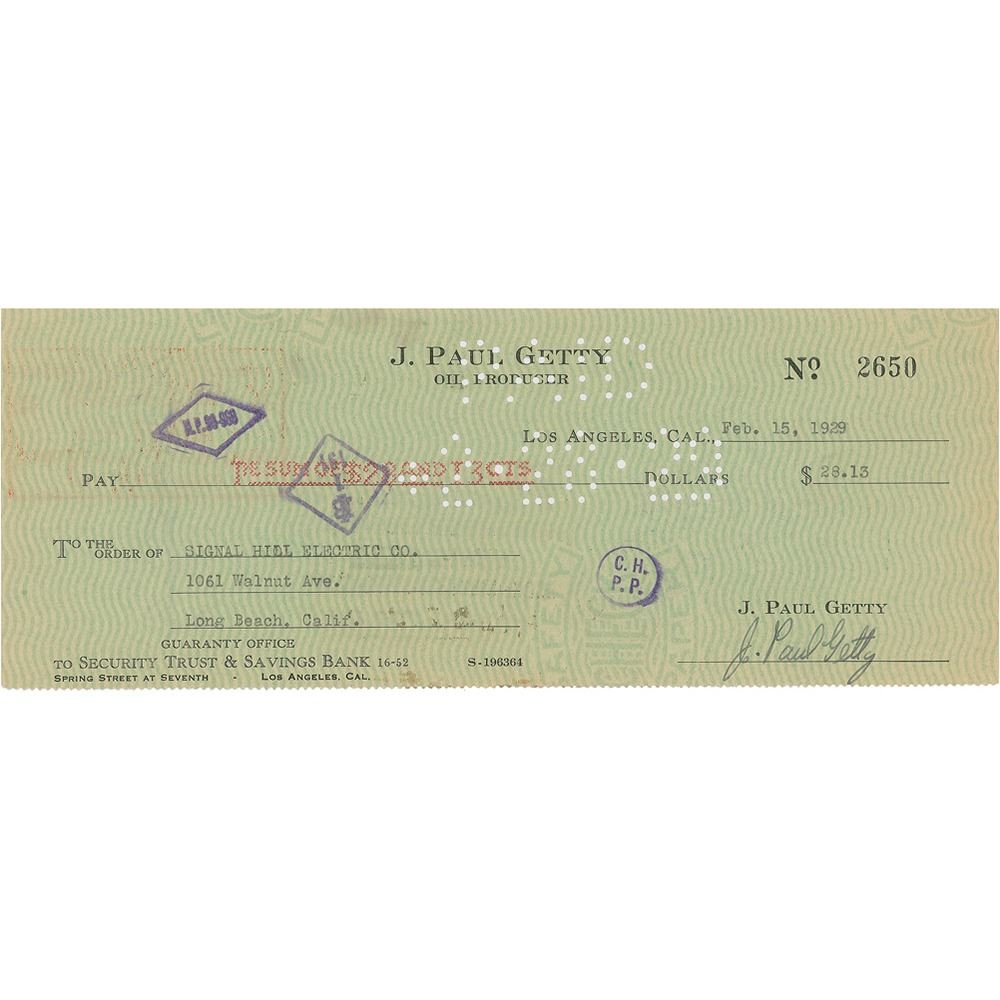 Personal check, 8.5 x 3.25, filled out in type and signed by Getty, "J. Paul Getty," payable to Signal Hill Electric Co. for $28.13, February 15, 1929. In fine condition.