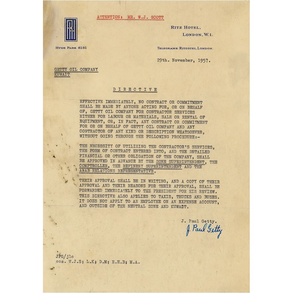 TLS, one page, 7 x 10, Ritz Hotel letterhead, November 29, 1957. Directive issued to the Getty Oil Company in Kuwait, implementing a new process for the approval of contracts. In part: "The necessity of utilizing the contractor's services, the form of contract entered into, and the detailed financial or other obligation of the company, shall be approved in advance by the Zone Superintendent, the Comptroller, the Refinery Superintendent and the Arab Relations Representative. Their approval shall be in writing, and a copy of their approval and their reasons for their approval, shall be forwarded immediately to the president for his review. This directive also applies to taxis, trucks and buses. It does not apply to an employee expense account, and outside of the neutral zone and Kuwait." In fine condition, with scattered stains in the left margin.