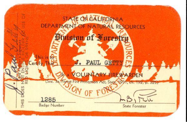 J. Paul Getty. California Division of Forestry Volunteer Fire Warden membership card. Act of 1931. Signed by Getty. Jean Paul Getty (December 15, 1892 – June 6, 1976) was an American industrialist. He founded the Getty Oil Company, and in 1957 Fortune magazine named him the richest living American, whilst the 1966 Guinness Book of Records named him as the world's richest private citizen, worth an estimated $1.2 billion (approximately $8.7 billion in 2013).