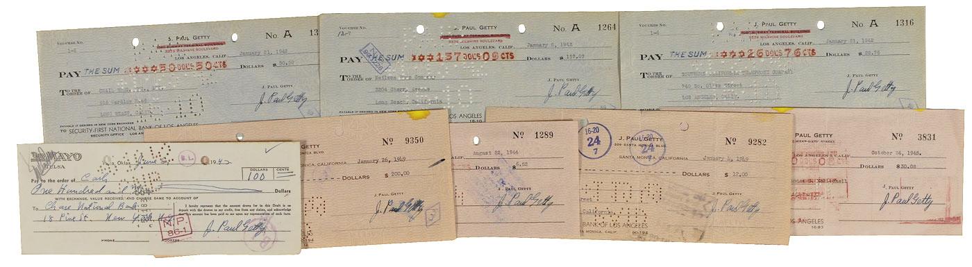 Eight checks, ranging in size from 8 x 3 to 8.25 x 3.25, one filled out by Getty and the others in type and each signed “J. Paul Getty,” dating from January 1942 to January of 1949. Two are also endorsed by Getty on the reverse. In overall very good to fine condition, with scattered creasing, expected bank holes and stamps, punch holes to top edges, and a couple of the signatures lightly affected by bank stamps or smudges.