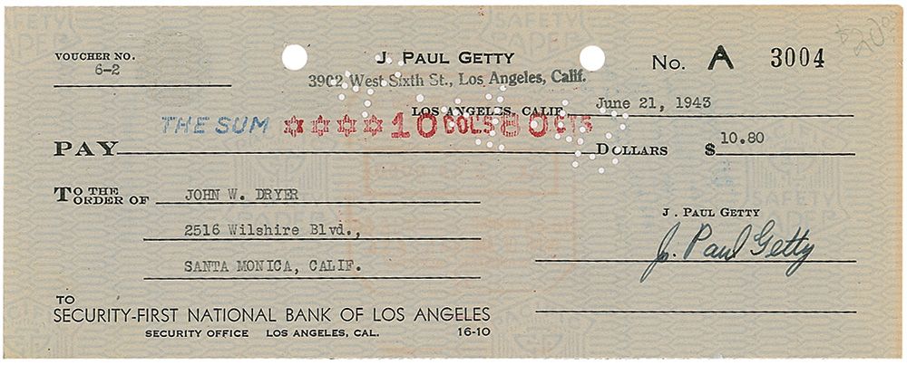 Personal check, 8.25 x 3.25, filled out in type and signed by Getty, payable to John W. Dryer for $10.80, June 21, 1943. Two punch holes to top edge, cancellation holes to top, light pencil notation, small label affixed to reverse, and scattered light toning, otherwise fine condition. Getty’s signature remains bold and unaffected by the flaws.