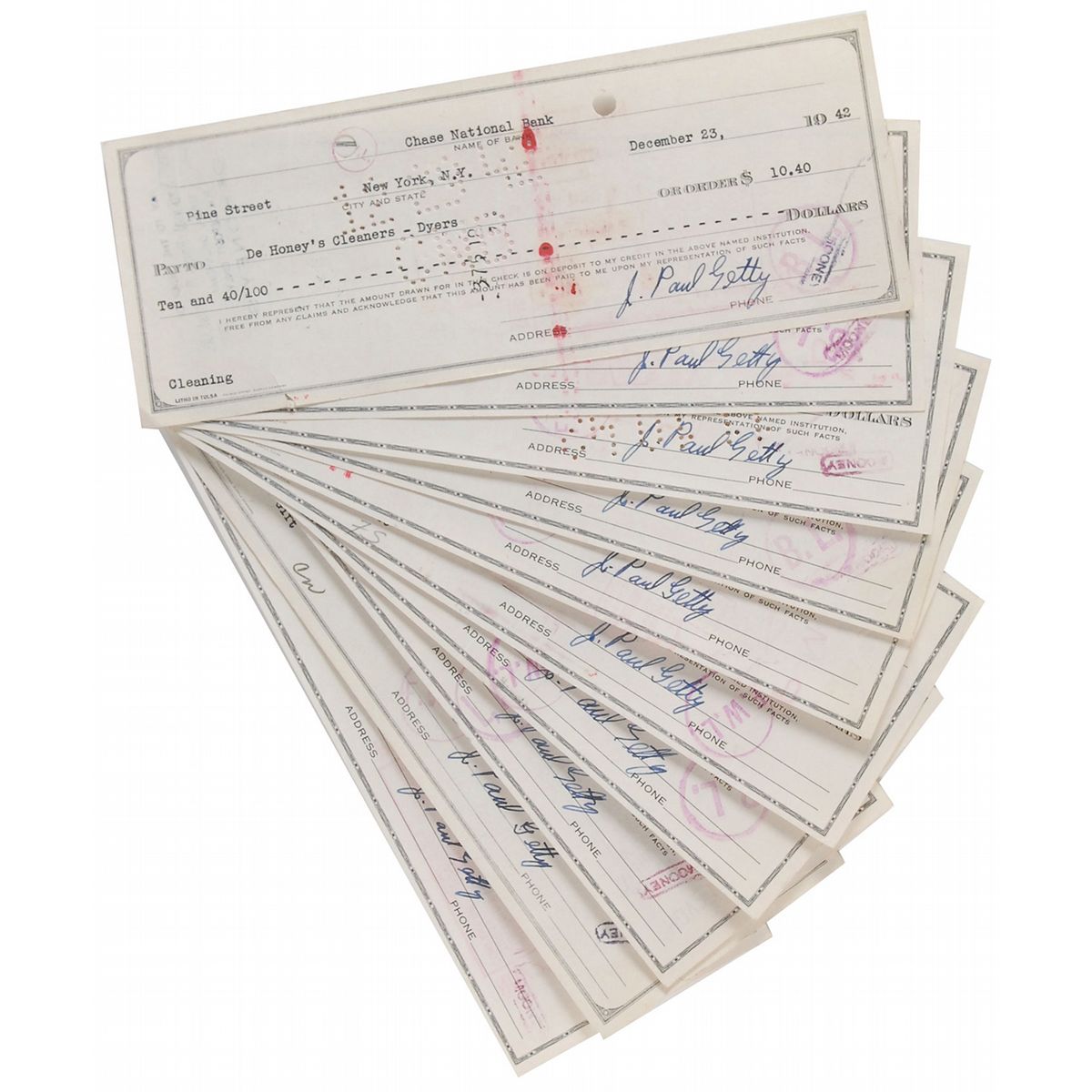 Ten bank checks, 8.25 x 3, filled out type and signed by Getty, “J. Paul Getty,” all dated 1942. In overall fine condition, with expected bank stamps and cancellation holes.
