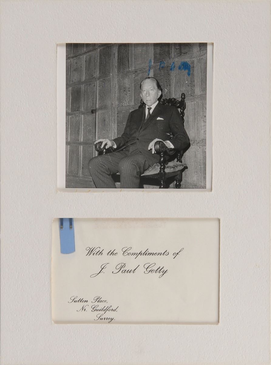 Glossy 3.5 x 3.25 photo of Getty seated in a striped suit, signed in blue ink, "J. P. Getty." Matted with a compliments card to an overall size of 6 x 8. In fine condition, with a few light surface impressions. Pre-certified PSA/DNA.