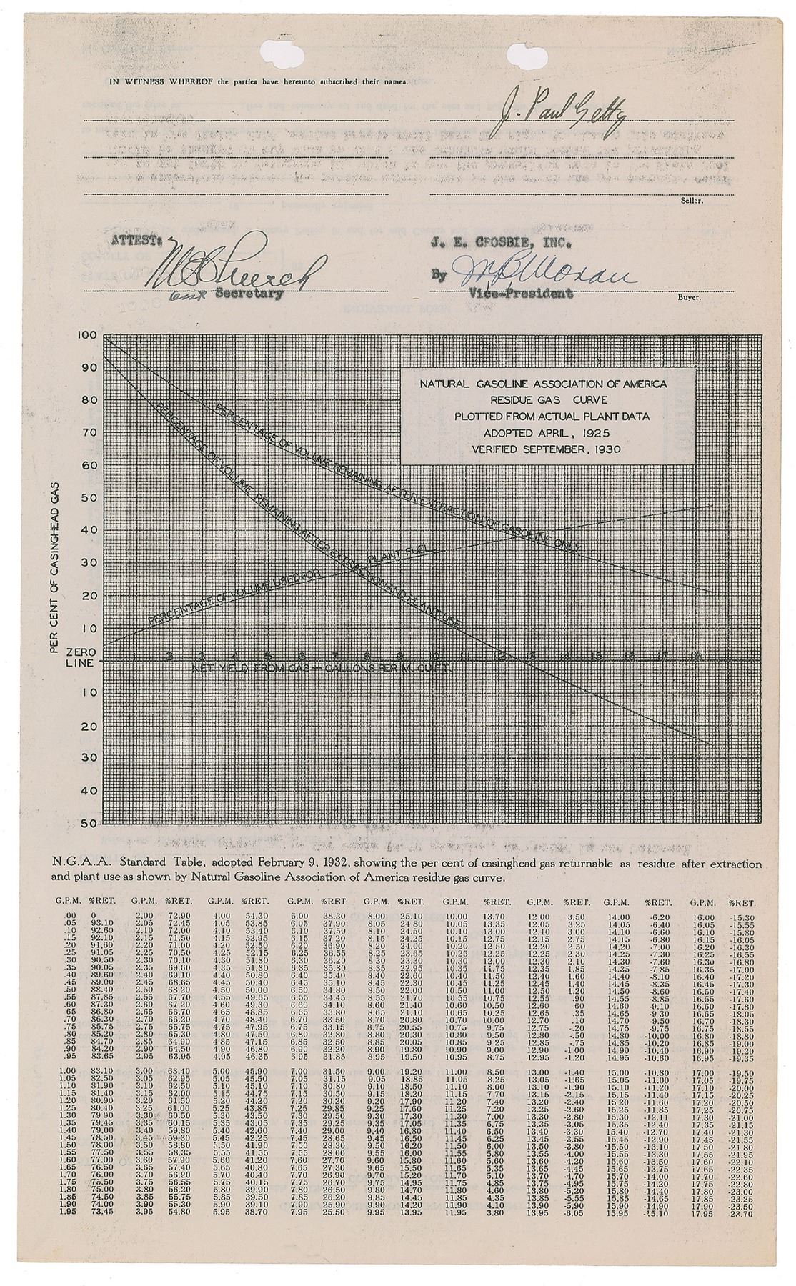 DS, three pages, 8.5 x 14, January 8, 1937. Casinghead gas contract between J. Paul Getty and J. E. Crosbie, Inc., in which the former "hereby grants, bargains, sells and agrees to deliver…all the casinghead now or hereafter produced from the wells on the lands" situate and being within the County of Pontotoc, State of Oklahoma. Signed neatly at the conclusion by Getty. In fine condition.