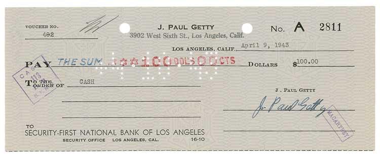 Personal check, 8.5 x 3.5, filled out in type and signed by Getty, payable to Cash for $100.00, April 9, 1943. In fine condition, with expected stamps and holes, with one stamp directly under signature, and punch holes to top edge. RRAuction COA.