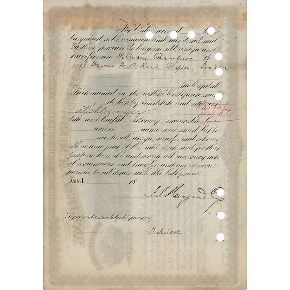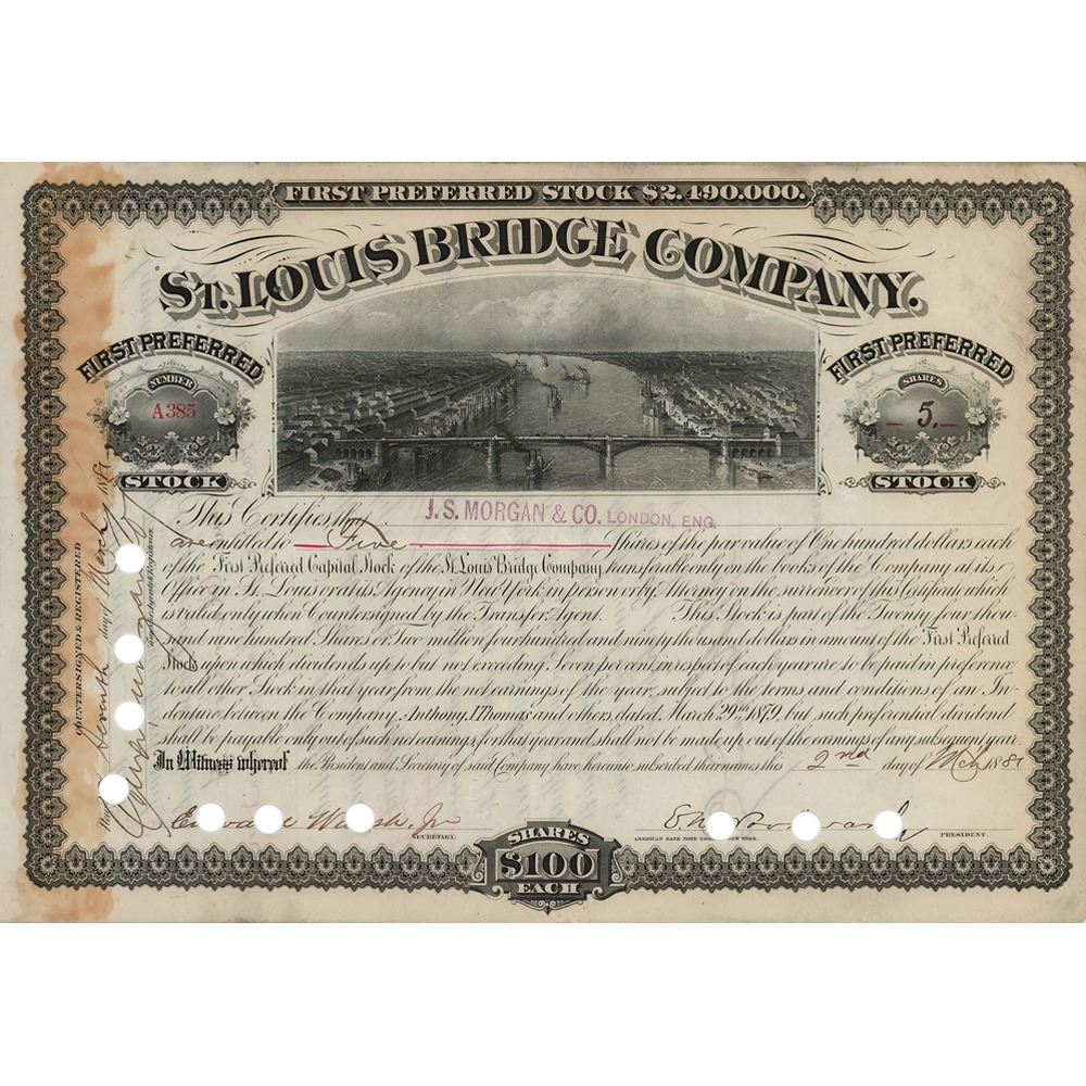 Partly-printed DS, signed “Pierpont Morgan,” one page, 11.5 x 8, March 2, 1881. Stock certificate issued to J. S. Morgan & Co. of London, England, for five shares of preferred stock in the St. Louis Bridge Company. Signed along the left edge by J. P. Morgan as a transfer agent. In fine condition, with light staining along the left edge.