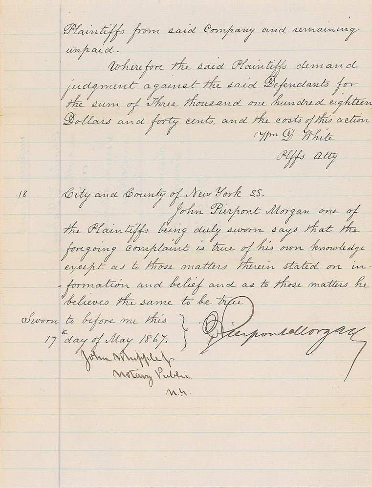Partial self-contained notarized DS, one lightly-lined page, 8 x 10.25, May 17, 1867. Final page of a longer legal document, with Morgan attesting to the true nature of the complaint “the Plaintiff being duly sworn says that the foregoing complaint is true of his own knowledge.” Signed at the conclusion by Morgan and also signed by a notary public. Page is affixed to a slightly larger sheet of yellow cardstock. In fine condition, with a bit of mild soiling along horizontal folds.