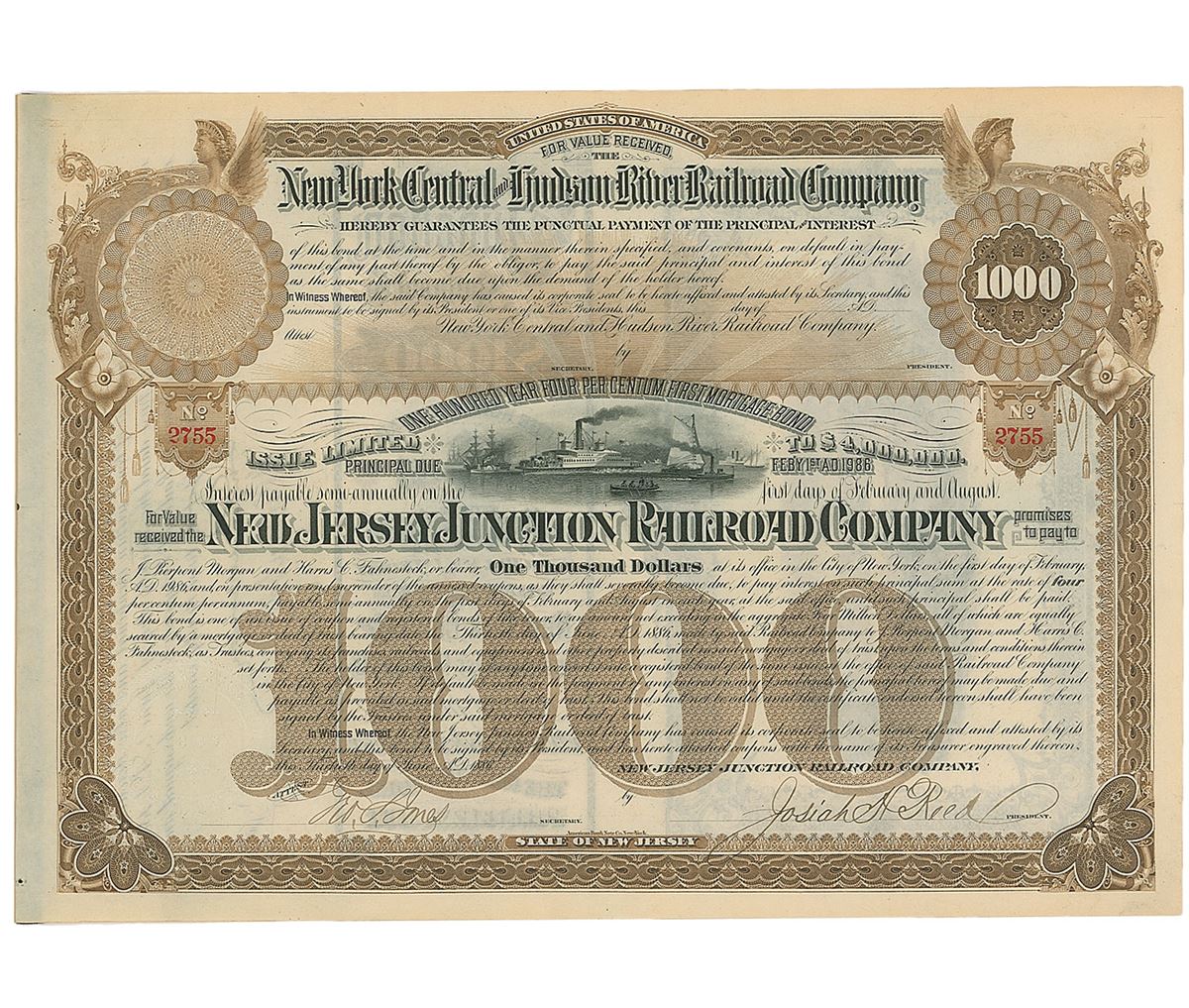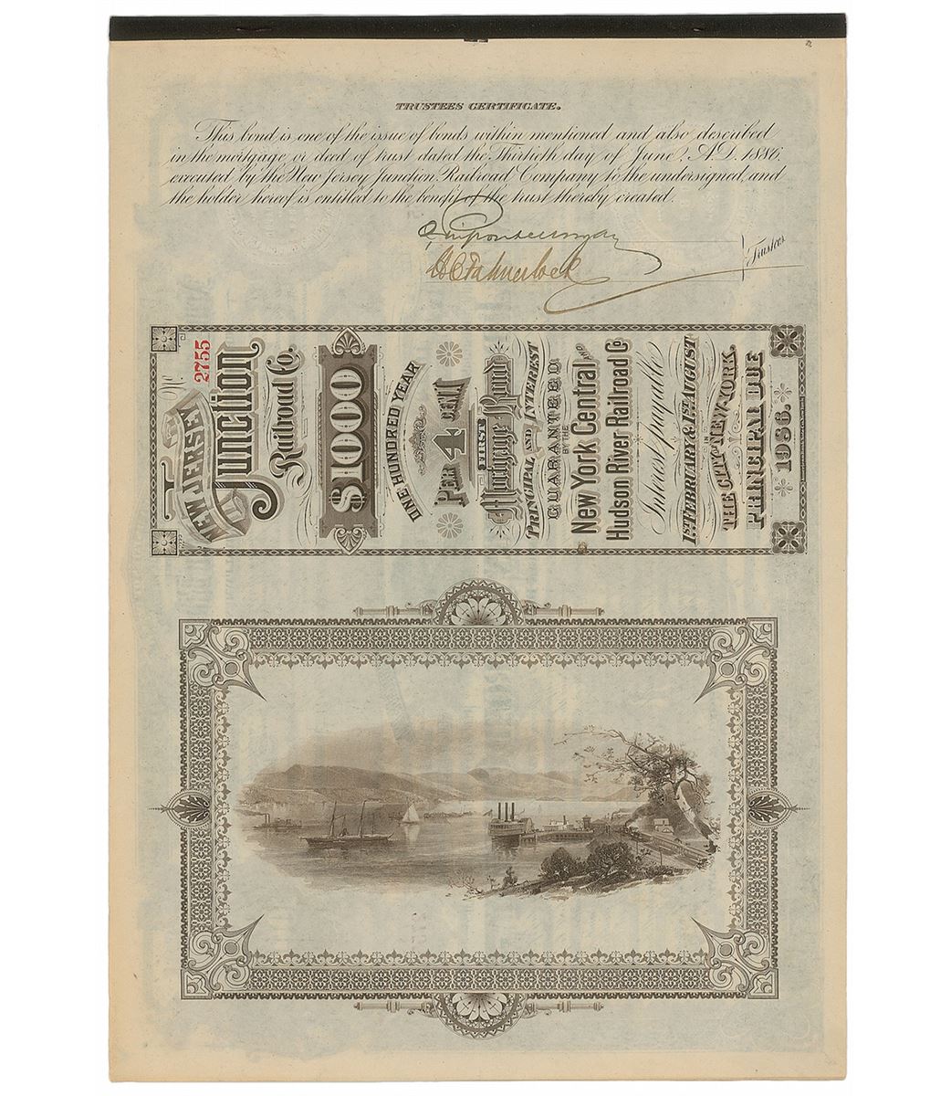 Handsome DS, one page both sides, 9.5 x 13.5, June 30, 1886. A one-hundred year bond issued by the New Jersey Junction Railroad Company for $1000, signed at the top by Morgan and Harris C. Fahnestock as trustees. Five sheets of coupons are bound to the top of the document, with just one coupon clipped off. In fine condition.