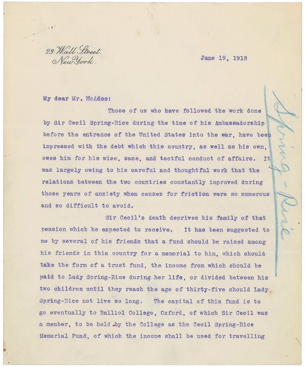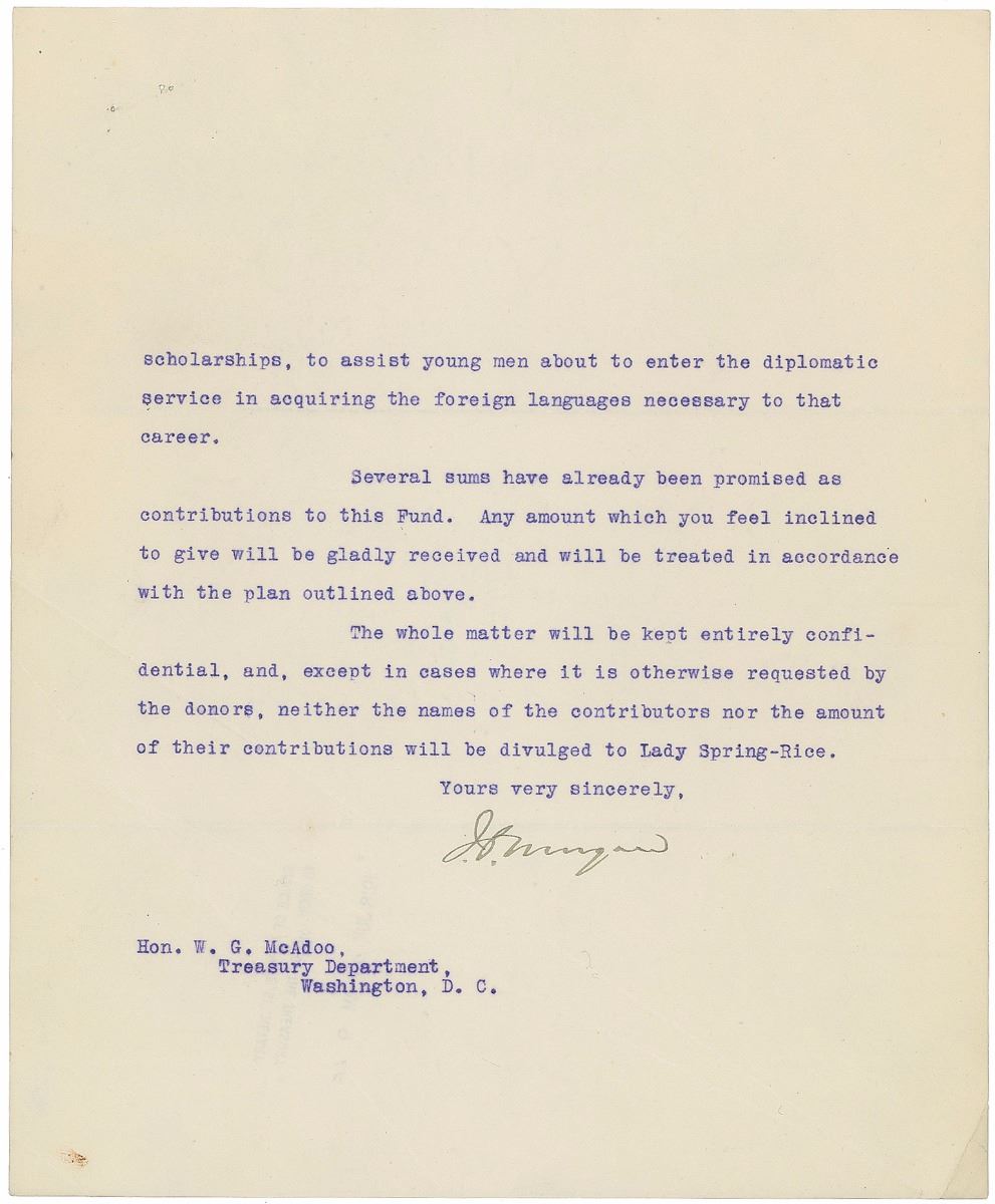 TLS signed “J. P. Morgan,” two pages, 8.25 x 10, 23 Wall Street letterhead, June 19, 1918. Letter to Secretary of the Treasury William McAdoo, in part: “Those of us who have followed the work done by Sir Cecil Spring-Rice during the time of his Ambassadorship…have been impressed with the debt which this country, as well as his own, owes him for his wise, sane, and tactful conduct of affairs…Sir Cecil’s death deprives his family of that pension which he expected to receive. It has been suggested to me by several of his friends that a fund should be raised…for a memorial to him, which should take the form of a trust fund, the income from which should be paid to Lady Spring-Rice during her life, or divided between his two children…the whole matter will be kept entirely confidential.” Pages pinned together, scattered creasing, light paperclip impressions to top edge, and large collector’s notations to right margin of first page, otherwise fine condition.