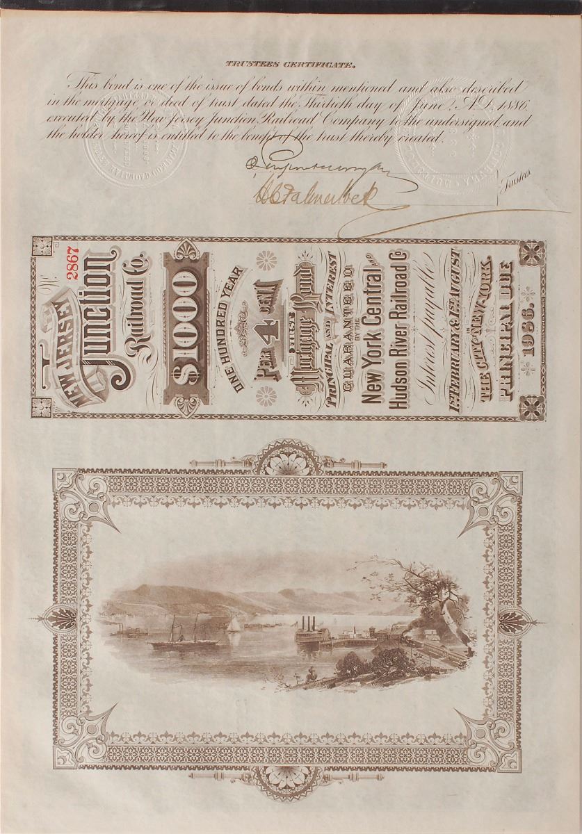 Handsome DS, one page both sides, 9.5 x 13.5, June 30, 1886. A one-hundred year bond issued by the New Jersey Junction Railroad Company for $1000, signed at the top by Morgan and Harris C. Fahnestock as trustees. Five sheets of coupons are bound to the top of the document, with just one coupon clipped off. In fine condition.