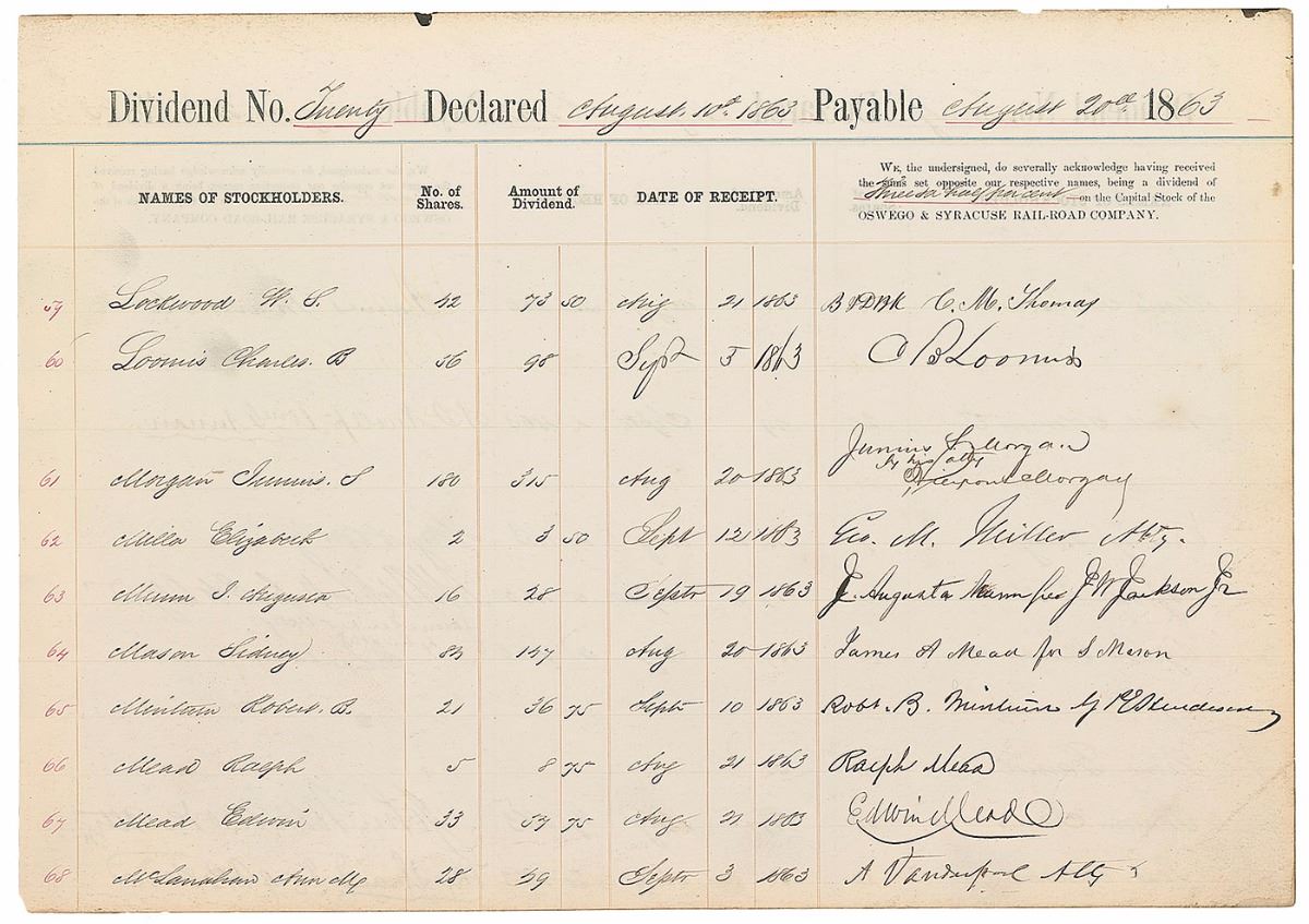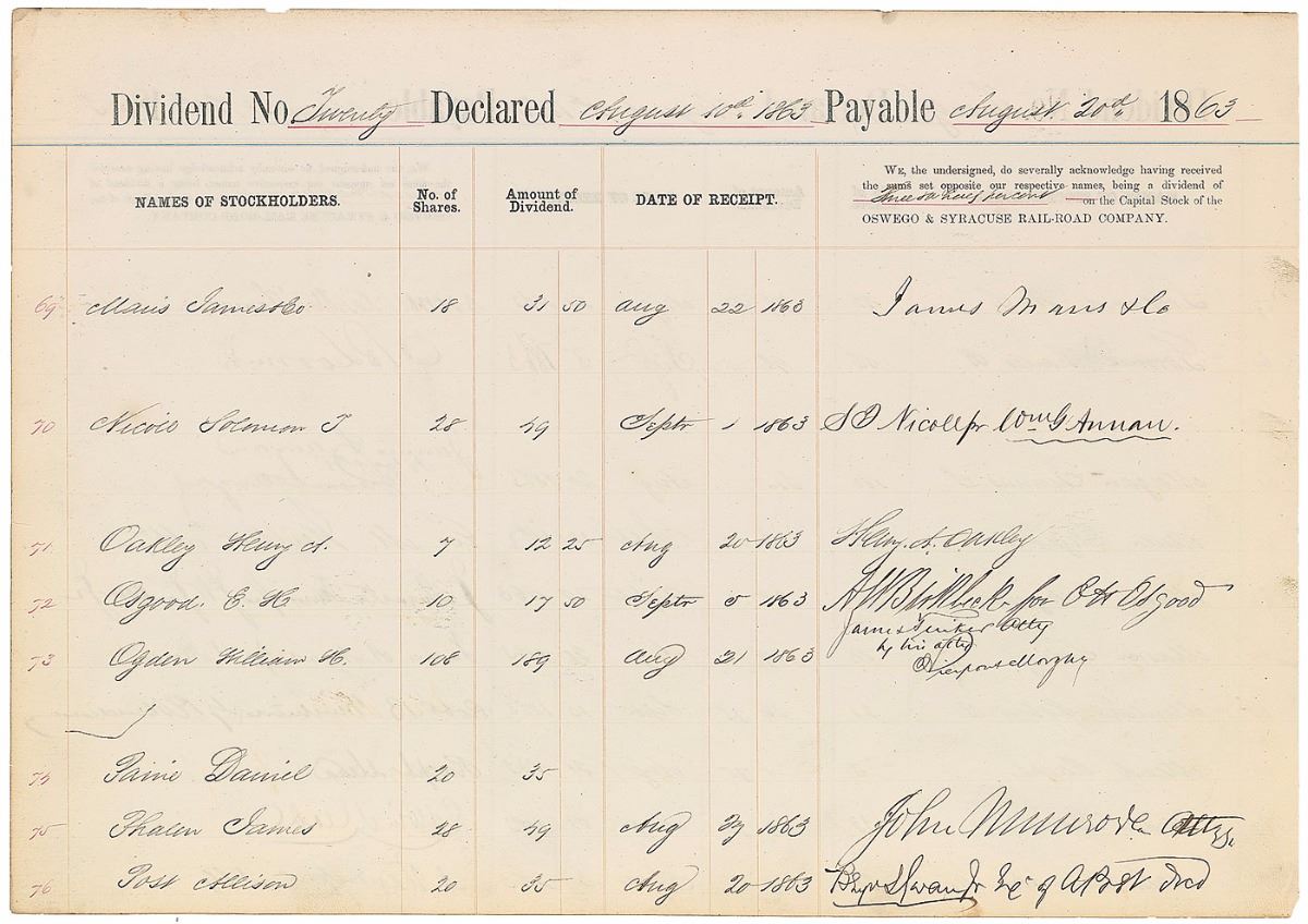 Uncommon twice-signed partly-printed DS, one page both sides, 13.5 x 9.5, August 20, 1863. A declaration of dividends made payable between August 10 and 22, 1863, for shareholders of the Oswego & Syracuse Railroad Company, signed by several shareholders in the right column in black ink, including Morgan, who signs on both sides for receipts dated August 20th and 21st. In fine condition. An appealing early signed document from the noted financier.