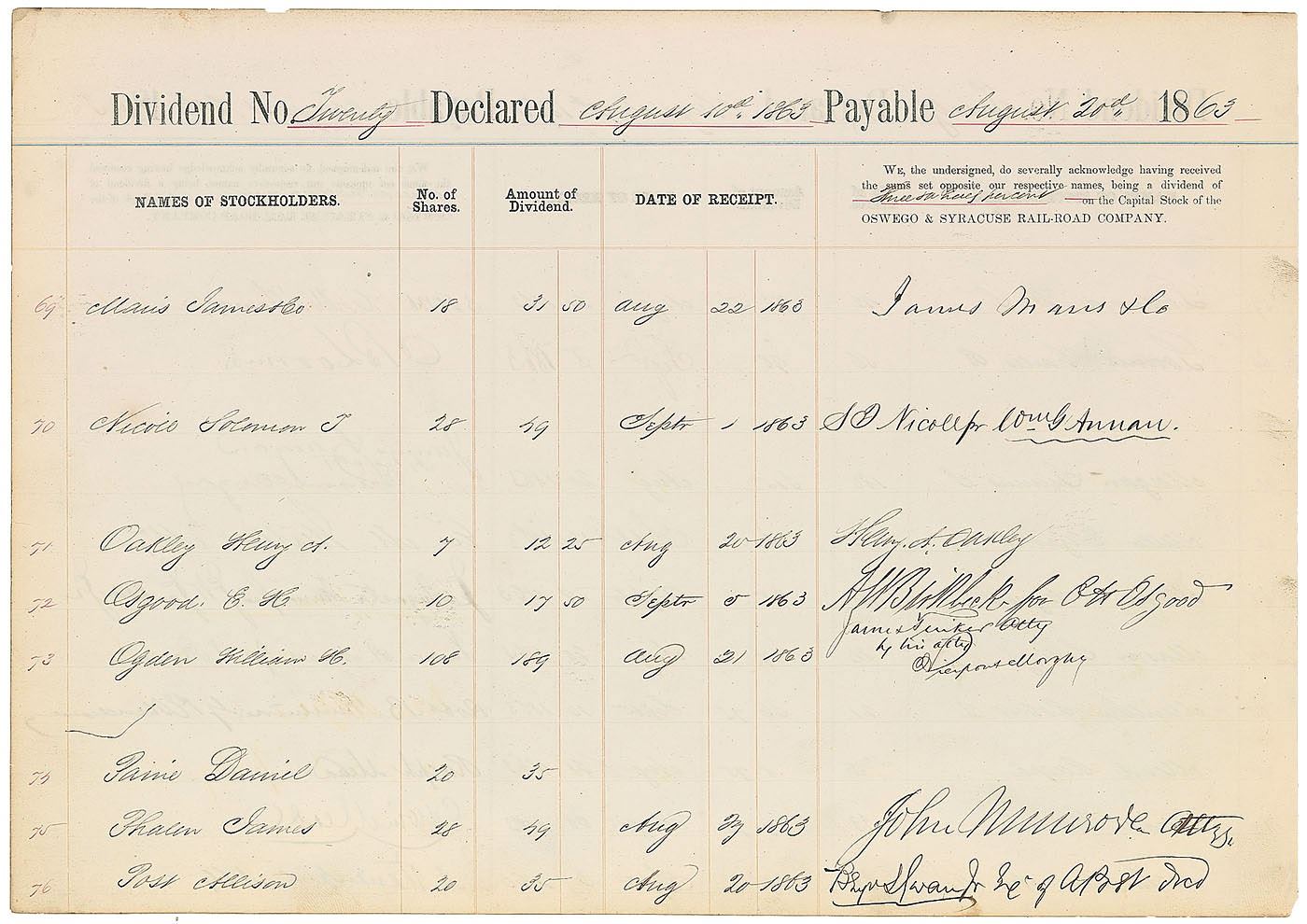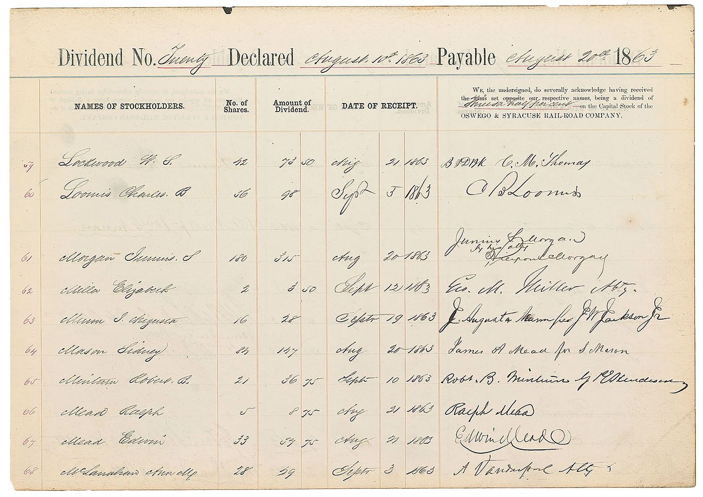 Uncommon twice-signed partly-printed DS, one page both sides, 13.5 x 9.5, August 20, 1863. A declaration of dividends made payable between August 10 and 22, 1863, for shareholders of the Oswego & Syracuse Railroad Company, signed by several shareholders in the right column in black ink, including Morgan, who signs on both sides for receipts dated August 20th and 21st. In fine condition. An appealing early signed document from the noted financier.