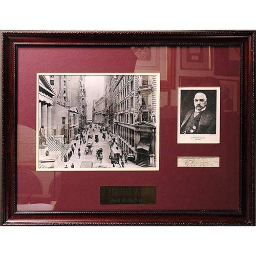 <Our item number 140796><B>Morgan, J. Pierpont.</B> (1837-1913) American banker and financier. Signature cut from a vellum document, n.p., n.d., 1x4½ in. Matted with a copy of a 10x12½ in. photograph of Wall Street taken in 1911 by Irving Underhill, a 6 x 4½ in. image of Morgan, and a plaque engraved "J. Pierpont Morgan / Owner of the Titanic" and handsomely framed to an overall size of 20¾ x 26½ inches. Morgan's company, International Mercantile Marine, bought the White Star Line in 1902. White Star decided to build the largest, most luxurious ships in the world. The first was the Olympic; the second was the ill-fated Titanic that sank in 1912. <BR>Estimated Value $300 - 400. <BR><BR>Our item number 140796<BR><IMAGES><P ALIGN="CENTER"><IMG SRC="http://www.goldbergcoins.net/liveauction/49jpegs/140796.jpg"> </P></IMAGES>