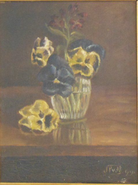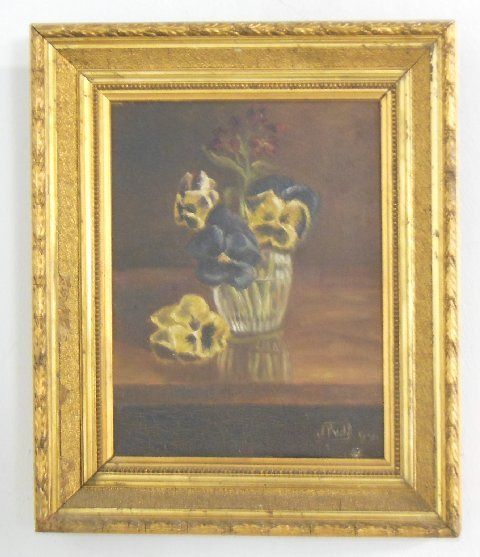 Depicting "Pansies". Image, approx. 10" x 7.5". Frame, approx. 13.25" x 10".