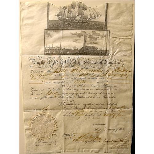 <Our item number 135758><B>Adams, John Q.</B> (1867-1848) 6th President of the United States (1825-29). Document signed ("J.Q. Adams") as President, 1p, vellum, 14¾ x 10½ in., Washington, 11 June 1825. Countersigned by Henry Clay ("H.Clay") as Secretary of State. A ship's passport for the brig Mazzinolu. Very good. Normal scalloped top edge with two maritime engravings. Vellum has two small areas of loss at folds, affecting a couple of letters of text; some creasing and uneven margins. Adams' signature is of medium boldness. Matted with images of Adams and Clay and framed to an overall size of 31 x 19½ in. <BR>Estimated Value $800 - 1,200. <BR><BR>Our item number 135758<BR><IMAGES><P ALIGN="CENTER"><IMG SRC="http://www.goldbergcoins.net/liveauction/49jpegs/135758.jpg"> </P></IMAGES>