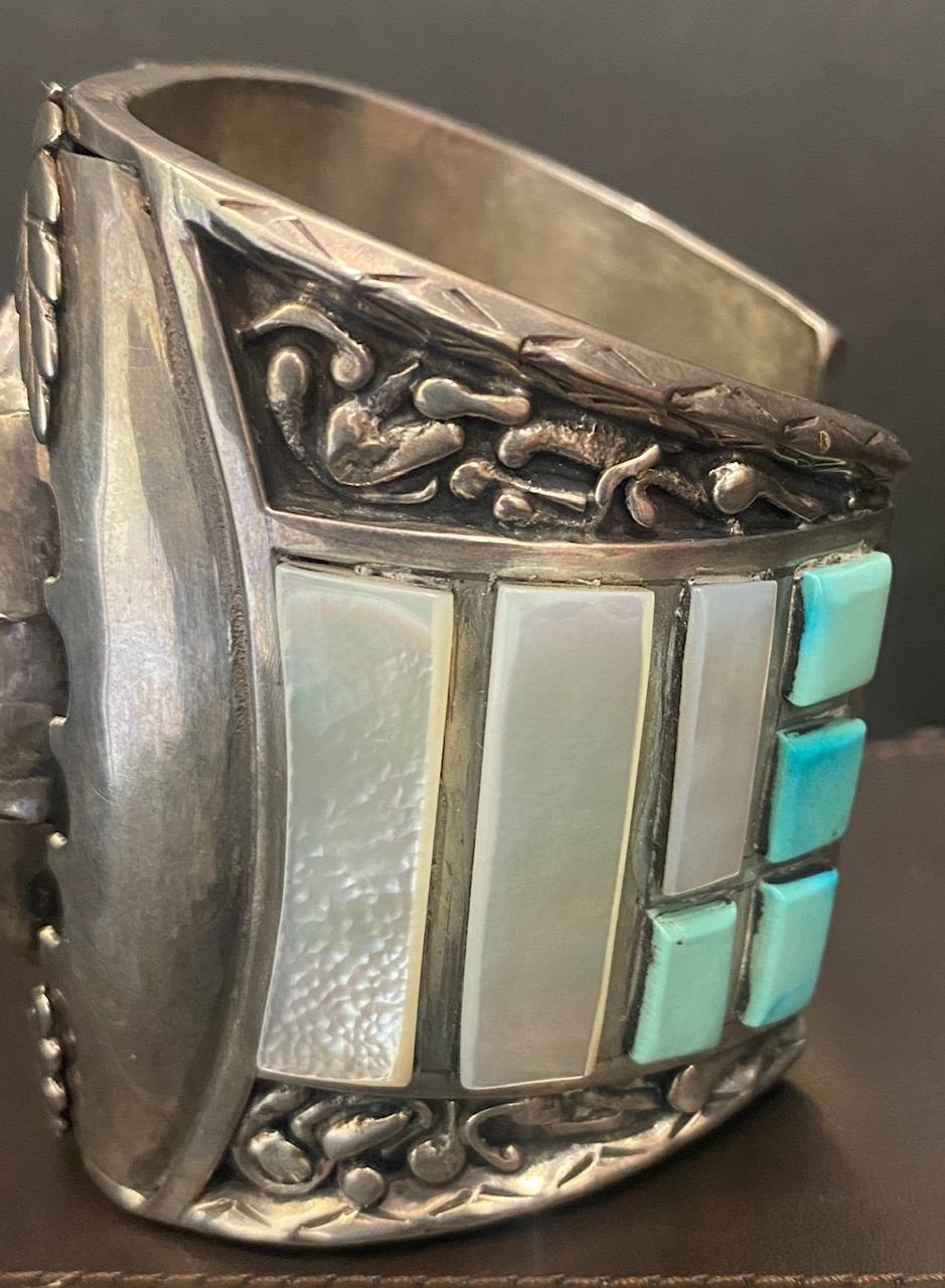 Bracelets measurements are opening, inside circumference, height. Weights are in Grams and are weighed to the best of our ability. The term signed means that, in our opinion, the signature is by the artist. All dating, Turquoise and hallmark attributions are to the best of our knowledge. Attributions are subjective and should be taken as such. Attributions in the description of any lot is left to the buyer to determine accuracy and the gallery is not responsible for any errors or omissions.