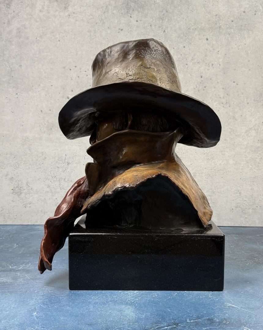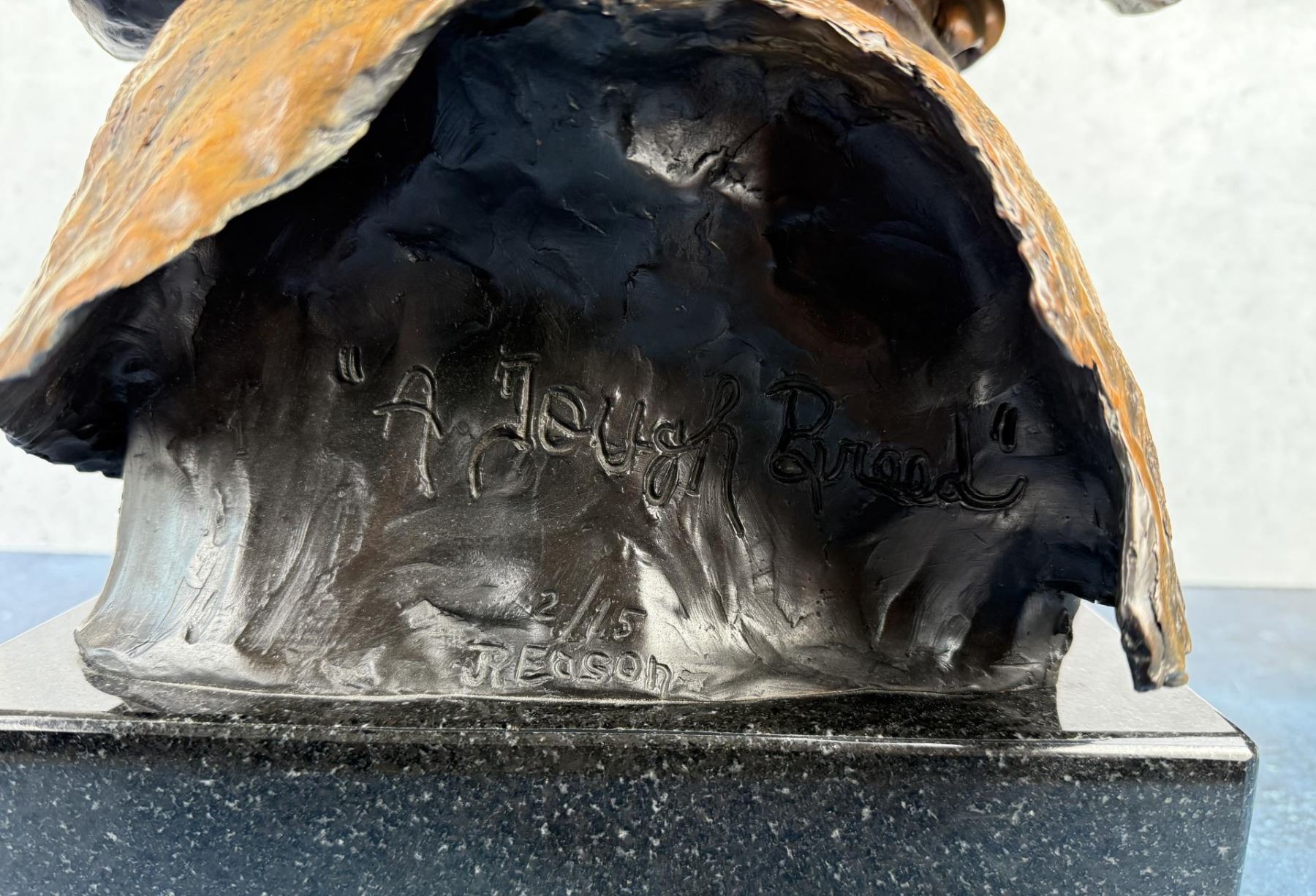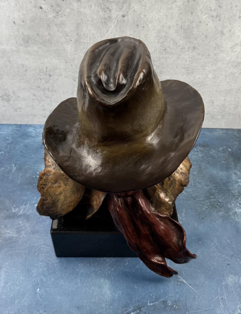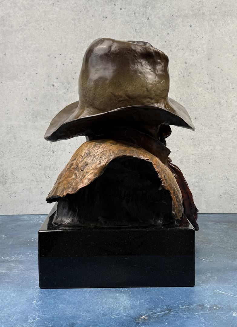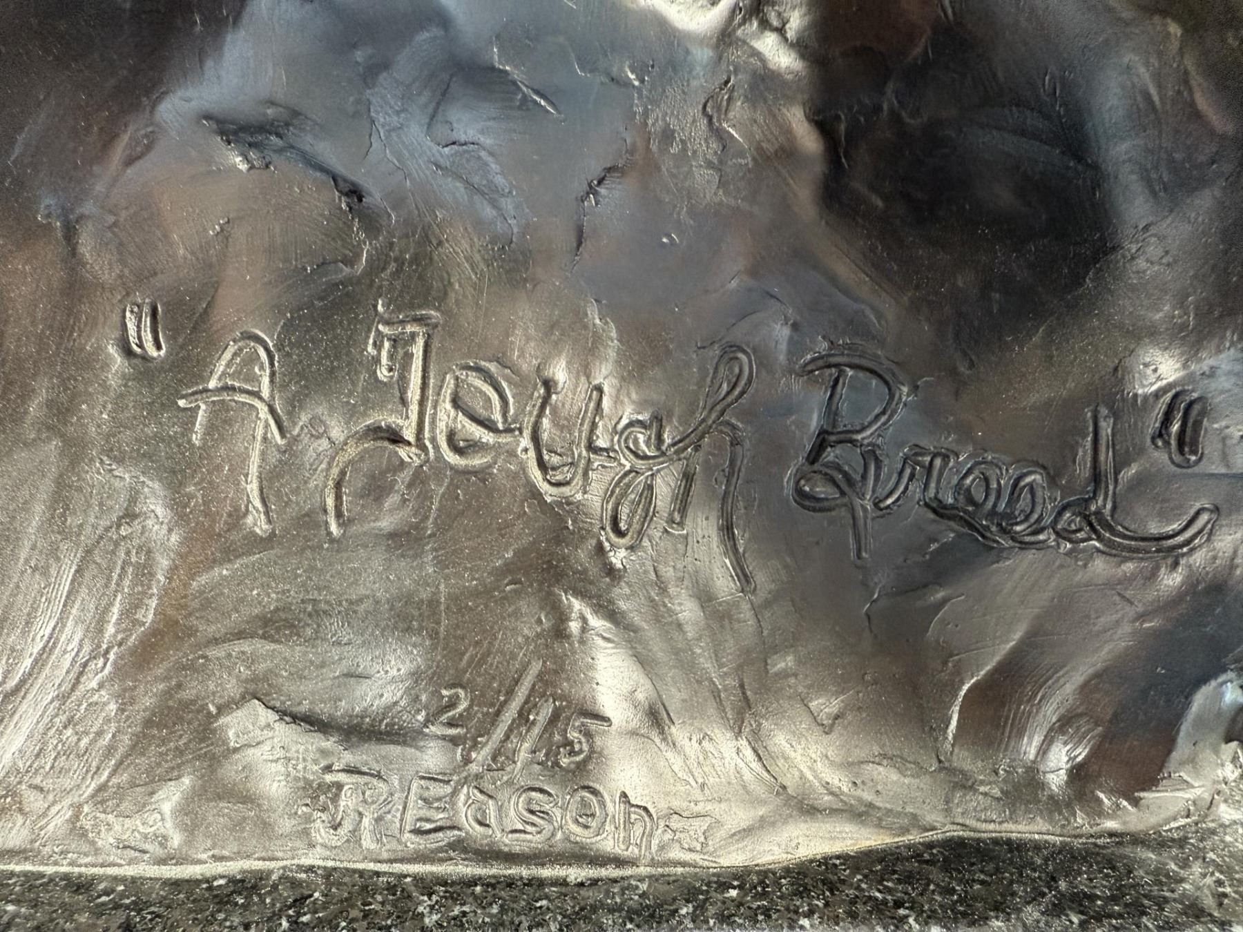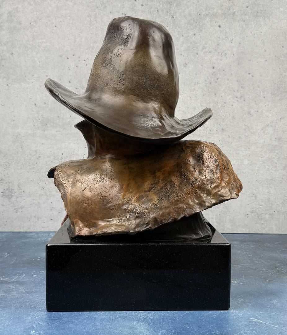 Title is A Tough Breed. 13 1/2" by 14" by 19". J. R. Eason (late 20th century) was active/lived in Montana, Arizona. J Eason is known for Sculptor-figurative, Indian. JR Eason sculpts what she knows best - people and their universal emotions. In doing this, she draws from her own well of emotion and finds it unnecessary to rely on photos or any means outside of her "self". Eason’s sculpture is easily recognized. With each piece, representational or stylized, the viewer is immediately drawn to the face. Here, you see and feel the emotion and relate to the message the artist portrays. Her unique, stylized form lends an earthiness that maximizes the subject of the piece. JR’s confidence in her own unique style developed after she determined to step out of the norm of ‘Western sculpture?, and fulfill her own expressive urges. Once gaining the credibility and success through museums and galleries, JR let go of her boundaries and her distinctive style came through. Born on a rural Idaho ranch, JR currently resides in Scottsdale, AZ, showing her works, and connecting with those who appreciate, and collect her figurative sculpture. JR has enjoyed a successful career as a full-time professional artist since 1988. JR’s work is collected throughout the United States and Canada, as well as over seas. She is represented with Fine Art Galleries throughout the states.