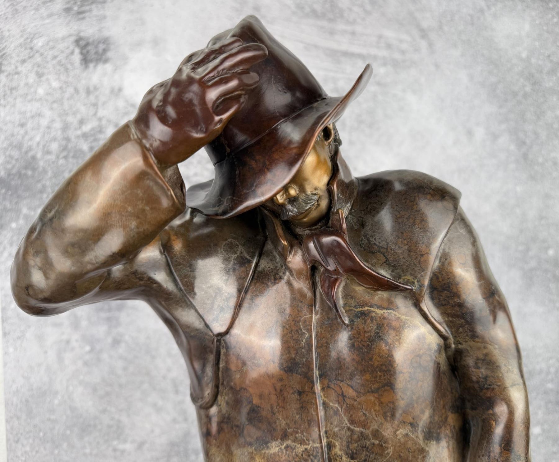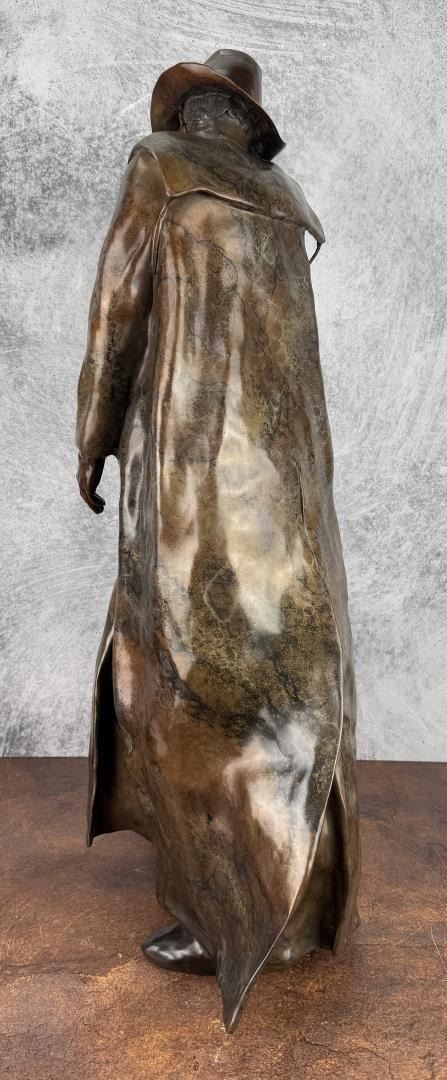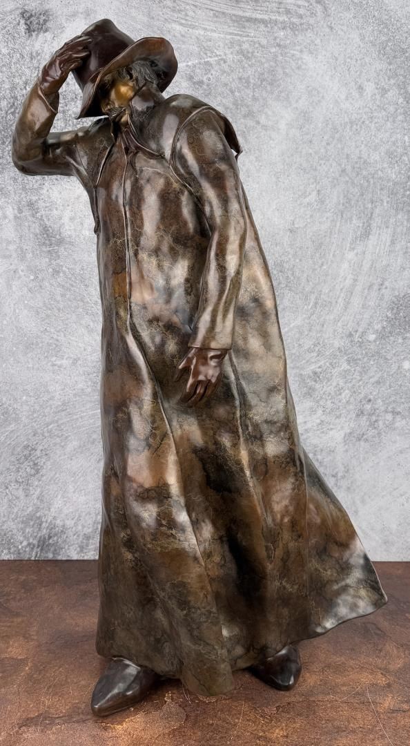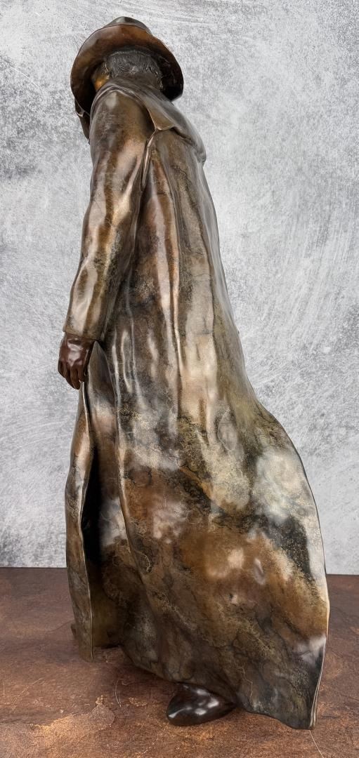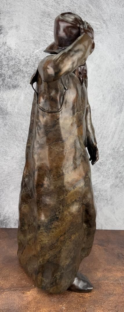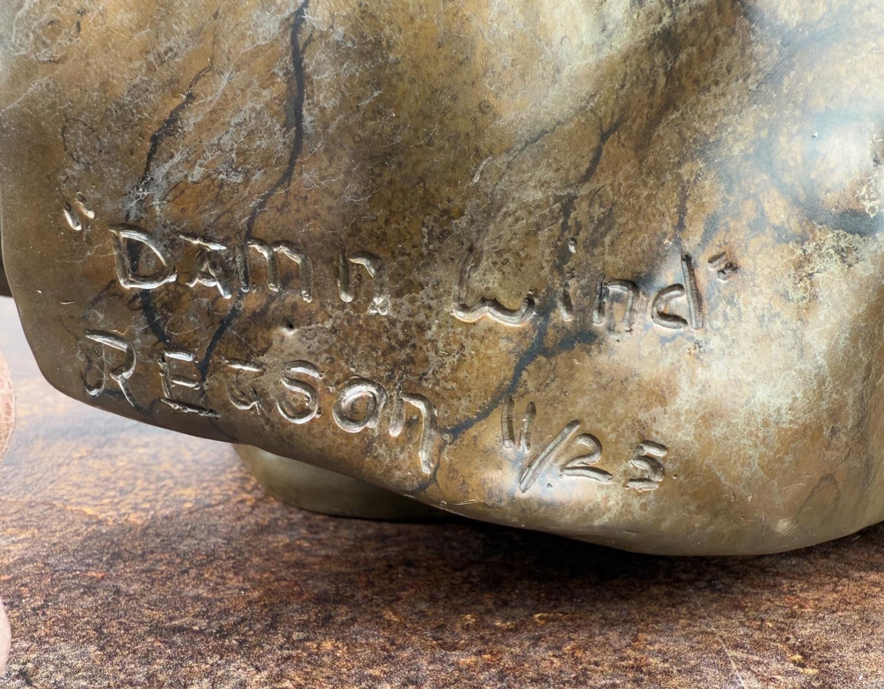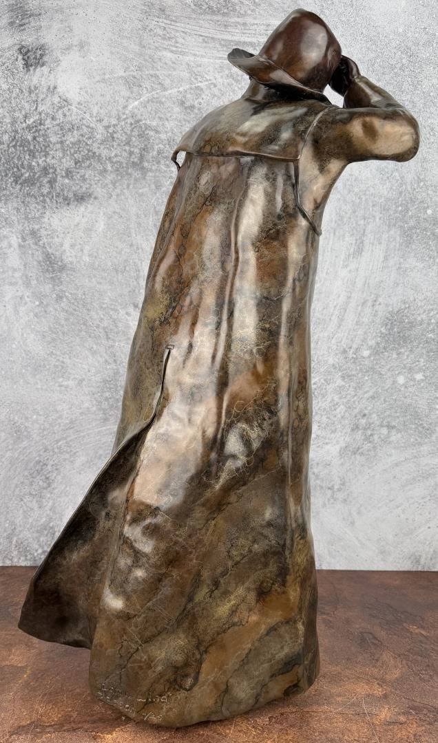Title is Damn Wind. 27" by 13 1/2" by 8 1/2". J. R. Eason (late 20th century) was active/lived in Montana, Arizona. J Eason is known for Sculptor-figurative, Indian. JR Eason sculpts what she knows best - people and their universal emotions. In doing this, she draws from her own well of emotion and finds it unnecessary to rely on photos or any means outside of her "self". Eason’s sculpture is easily recognized. With each piece, representational or stylized, the viewer is immediately drawn to the face. Here, you see and feel the emotion and relate to the message the artist portrays. Her unique, stylized form lends an earthiness that maximizes the subject of the piece. JR’s confidence in her own unique style developed after she determined to step out of the norm of ‘Western sculpture?, and fulfill her own expressive urges. Once gaining the credibility and success through museums and galleries, JR let go of her boundaries and her distinctive style came through. Born on a rural Idaho ranch, JR currently resides in Scottsdale, AZ, showing her works, and connecting with those who appreciate, and collect her figurative sculpture. JR has enjoyed a successful career as a full-time professional artist since 1988. JR’s work is collected throughout the United States and Canada, as well as over seas. She is represented with Fine Art Galleries throughout the states.