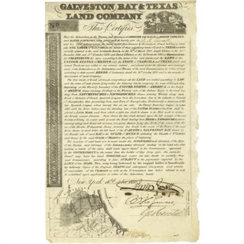 <B>Joel Roberts Poinsett's Certificate for Texas Land,</B></I> partially printed Galveston Bay & Texas Land Company document signed by three trustees representing Lorenzo de Zavela, Joseph Vehlein and David G. Burnet, one page, 8" x 12.5", New York City, October 16, 1830. Made out for "<I>one labor</B></I>" or land to "<I>J. R. Poinsett</B></I>" and bearing a map showing the East Texas empresario in which the property was located. Uneven right edge as made, very fine condition. Collectible in its own right, this document is enhanced by being drawn up for South Carolinian Joel R. Poinsett (1779-1851). One of the nation's more remarkable men during an era of remarkable men, Poinsett was a medical doctor, botanist, politician and diplomat. He was heavily engaged in trying to secure Texas for the United States and was, indeed, our country's first ambassador to an independent Mexico City. His name, of course, lives on in the tropical holiday plant he discovered. <I>From the collection of Darrel Brown.</B></I><BR><BR><B>Reference:</B></I> Streeter 1117<BR><BR><b>Shipping:</b> Flat Material, Small (<a target="_blank" href="http://www.heritageauctions.com/common/shipping.php">view shipping information</a>)