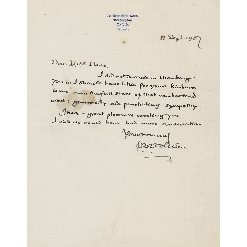ALS, one page, 7 x 9, 76 Sandfield Road letterhead, September 11, 1957. Handwritten letter to Miss Dane, in full: "I did not succeed in thanking you as I should have liked for your kindness to me—in the full sense of that use-battered word: generosity and penetrating sympathy. It was a great pleasure meeting you. I wish we could have had more conversation." In very good to fine condition, with scattered stains and light overall creasing.