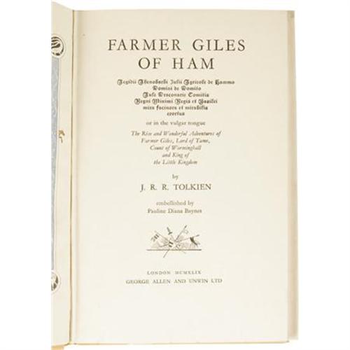 <B>J. R. R. Tolkien: <I>Farmer Giles of Ham</B></I></B></I> embellished by Pauline Diana Baynes (London: George Allen and Unwin Ltd., 1949), first edition, first issue, 79 pages, light orange boards with blue titles, 8vo (5.25" x 8"), dust jacket. Color frontispiece. Profusely illustrated. Top edge stained blue, "6s. net" on the inner dust jacket flap. Tolkien's early novella is a folk tale set in a fantasy version of England and relates the story of Farmer Giles' encounters with a dragon named Chrysophylax. Very good condition with a slightly cocked spine and minimal foxing to the text edges in a very good unclipped dust jacket.<BR><BR><b>Shipping:</b> Books & Catalogs (<a target="_blank" href="http://www.heritageauctions.com/common/shipping.php">view shipping information</a>)