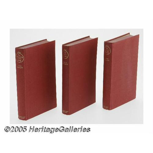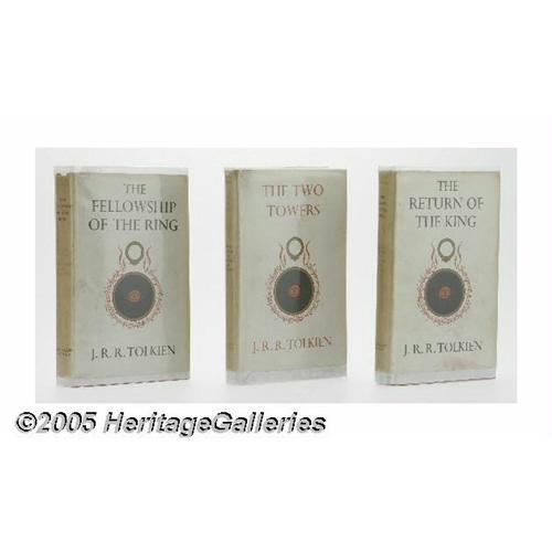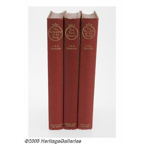 <B>J. R. R. Tolkien -- ""The Lord of the Rings,"" First Edition Set with Dust Jackets (George Allen & Unwin, 1954-55).</B></I> After years of negotiating, it was eventually agreed that publisher Allen & Unwin would publish J. R. R. Tolkien's <B>The Lord of the Rings</B></I> in three volumes. After a long and difficult period of production, " "<B>The Fellowship of the Ring</B></I> was published on July 21, 1954. " "<B>The Two Towers</B></I> followed this on November 11, 1954 and " "<B>The Return of the King</B></I> finally appeared on October 20, 1955. Presented here are first editions of each of these eventful books, including the dust jacket for each. The dust jackets show some aging along the edges, especially along the spines, with some ink loss on some of the type. Overall the jackets are in Good condition. The books have a bit of aging apparent, especially on the inside front and back covers. The previous owner's inscription is on the first page of each volume. The covers exhibit a bit of edge wear, and some light rubbing, but are in Very Good condition. Of this classic in world literature only 3500 sets were printed and no doubt fewer survived the past half century. Add this crown jewel to your collection with this remarkable offering! <BR><BR><B>Important notice:</B> Heritage usually auctions material at the rate of 200-250 lots per hour. On some occasions eBay Live bid software or the Internet may not be able to keep up with the pace of the auction. We recommend placing a realistic absentee bid now as insurance to avoid disappointment. Occasionally the auctioneer may eliminate or reject an eBay Live bid, and the auctioneer may also reopen a lot after the close of the eBay live bidding (usually because we missed an audience bid), and may reject your bid even if it shows you as the winning bidder. By bidding via eBay Live, you agree that Heritage may award the lot to another bidder at its sole discretion under the circumstances described above or any other re