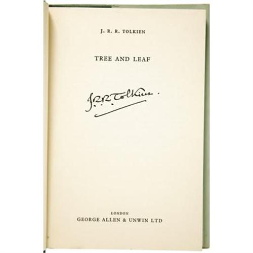 <B>J. R. R. Tolkien: <I>Tree and Leaf</B></I></B></I> (London: George Allen & Unwin, 1964), first edition, 92 pages, green cloth with gilt lettering on spine, 12mo (5" x 7.5"), dust jacket. Contains an introductory note, the nonfiction essay "On Fairy-stories" and the short fantasy "Leaf by Niggle." Fine book in a near fine unclipped dust jacket with a lightly sunned spine.<BR><BR><b>Shipping:</b> Books & Catalogs (<a target="_blank" href="http://www.heritageauctions.com/common/shipping.php">view shipping information</a>)