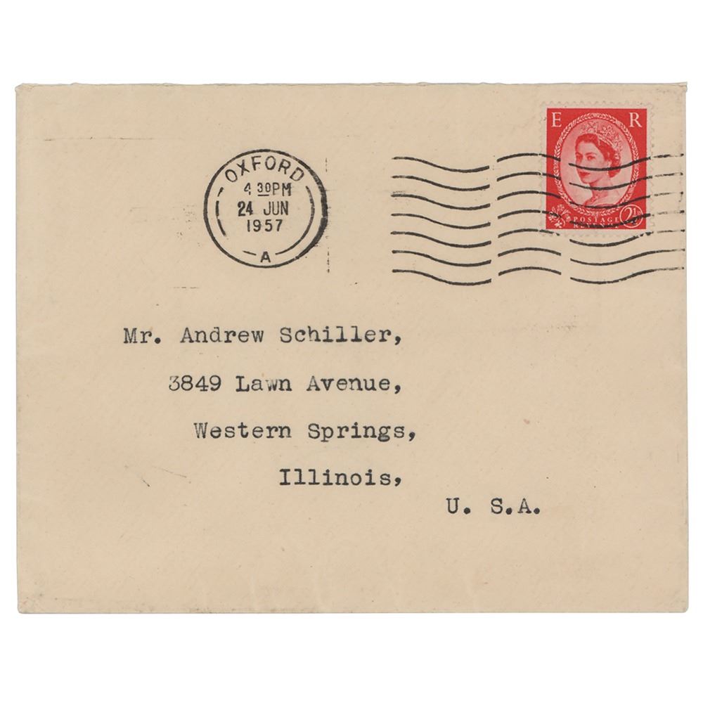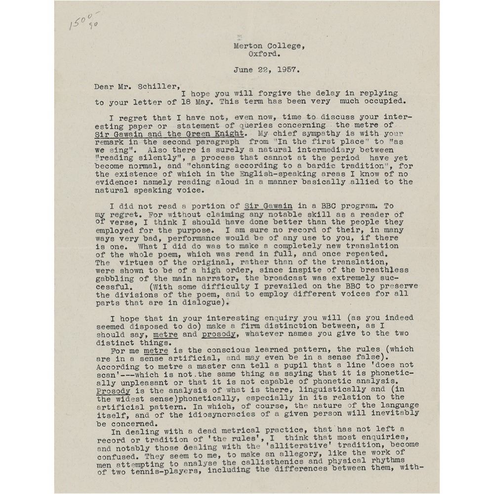 TLS, two pages, 8 x 10.25, June 22, 1957. Letter to Andrew Schiller, commenting on the classic medieval tale 'Sir Gawain and the Green Knight' and the structural rules of the English language. In part: "I regret that I have not, even now, time to discuss your interesting paper or statement of queries concerning the metre of Sir Gawain and the Green Knight. My chief sympathy is with your remark in the second paragraph from 'In the first place' to 'as we sing.' Also there is surely a natural intermediary between 'reading silently,' a process that cannot at the period have yet become normal, and 'chanting according to a bardic tradition,' for the existence of which in the English-speaking areas I know of no evidence; namely reading aloud in a manner basically allied to the natural speaking voice.