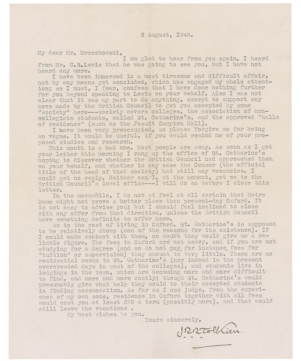 At the time he wrote this letter, Tolkien was an English professor at Oxford, where he taught from 1925 to 1959. His close friend C. S. Lewis also served on the Oxford faculty. The pair became friendly as members of Kolbítar, an Old Norse reading group, and the Inklings, an informal discussion society that encouraged the writing of fantasy. Tolkien’s friend Mroczkowski would not attend Oxford in 1946, but rather spent a year as a Research Fellow at University of Notre Dame in the United States, where he worked towards his doctorate in English Literature. Mroczkowski later spent a year in Oxford in the late 1950s, where he met Tolkien, Lewis, and other members of the Inklings. "I presented myself to Tolkien in the following way,” reminisced Mroczkowski. “I come from Mordor, I come from Mordor.” A fine letter from the celebrated fantasist.
