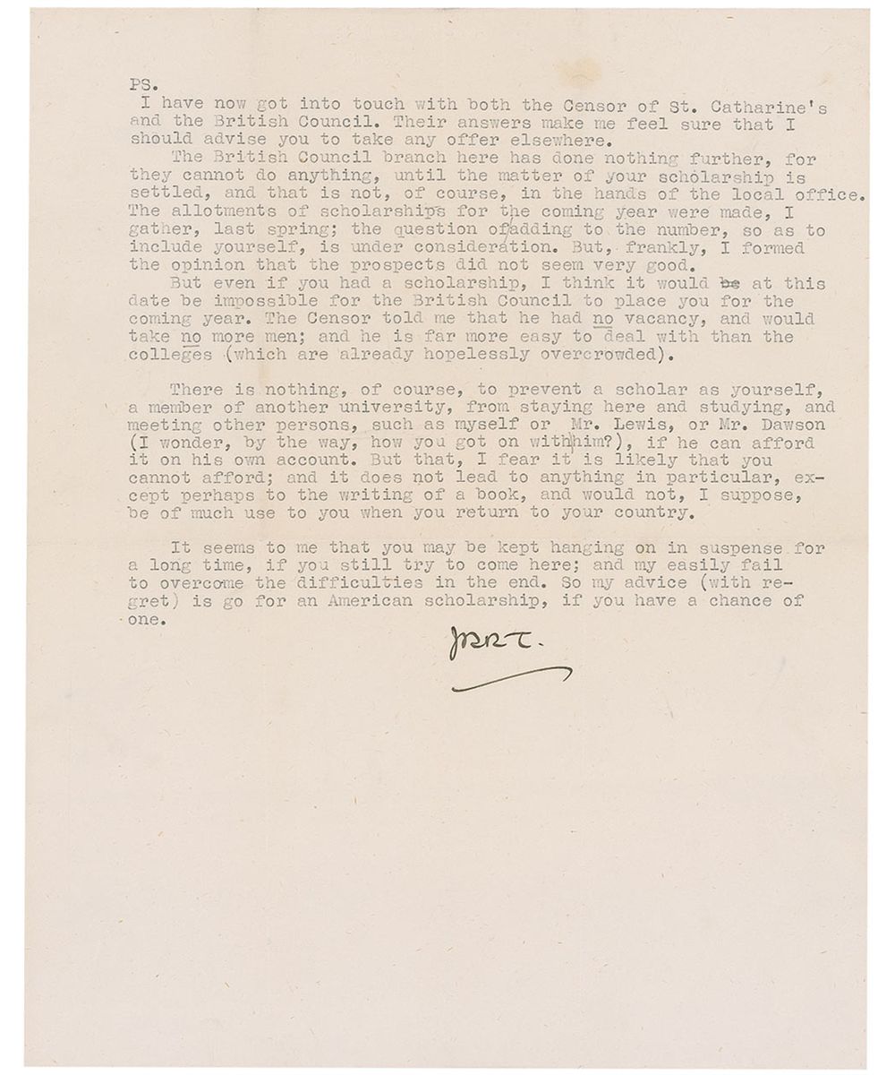 Tolkien uses the second page to add a lengthy postscript, which reads, in part: “I have now got into touch with both the Censor of St. Catharine's and the British Council. Their answers make me feel sure that I should advise you to take any offer elsewhere…I think it would at this date be impossible for the British Council to place you for the coming year. The Censor told me that he had no vacancy, and would take no more men; and he is far more easy to deal with than the colleges.” Postscript is signed “J.R.R.T.” In fine condition, with intersecting mailing folds, one through a single letter of the letter’s signature, and a few light wrinkles.