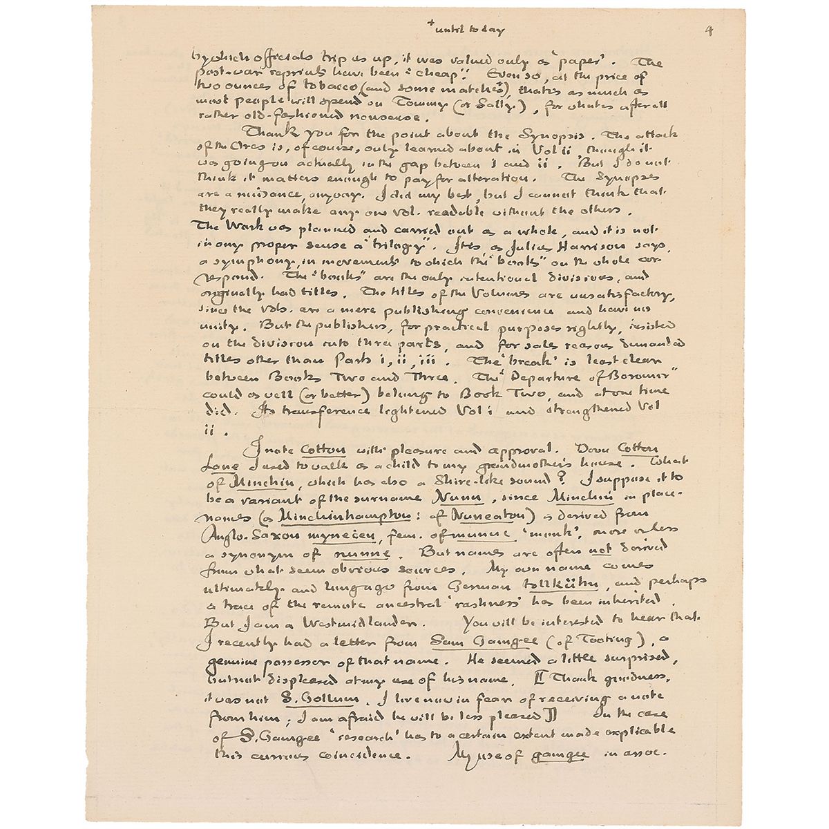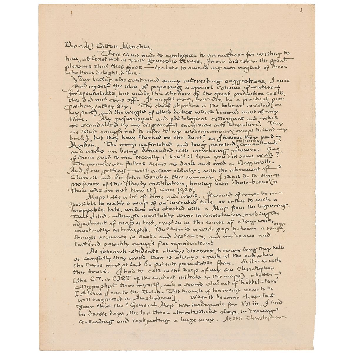 ALS, five pages on three sheets, 7.5 x 9.5, no date. Letter to admirer H. Cotton Minchin regarding publication of The Lord of the Rings, his interests in the Elvish tongues he invented and their attendant fanciful scripts, and his plans to complete The Silmarillion. In part: “Your letter also contained many interesting suggestions. I once had myself the idea of preparing a special volume of material for ‘specialists,’ but under the shadow of the great production costs this did not come off. It might now, however, be a practical position, as they say. The chief objection is the labour involved (on my part) and the weight of other duties which demand most of my time. My professional and philological colleagues and critics are scandalized by my disgraceful excursion into ‘literature.’ They are kind enough not to refer to my misdemeanor (except behind my back), but they have ‘turned on the heat’ as I believe they said in Mordor. The many unfinished and long promised professional commitments and works are being demanded with increasing pressure. One of them said to me recently: ‘Isn’t it time you did some work?’