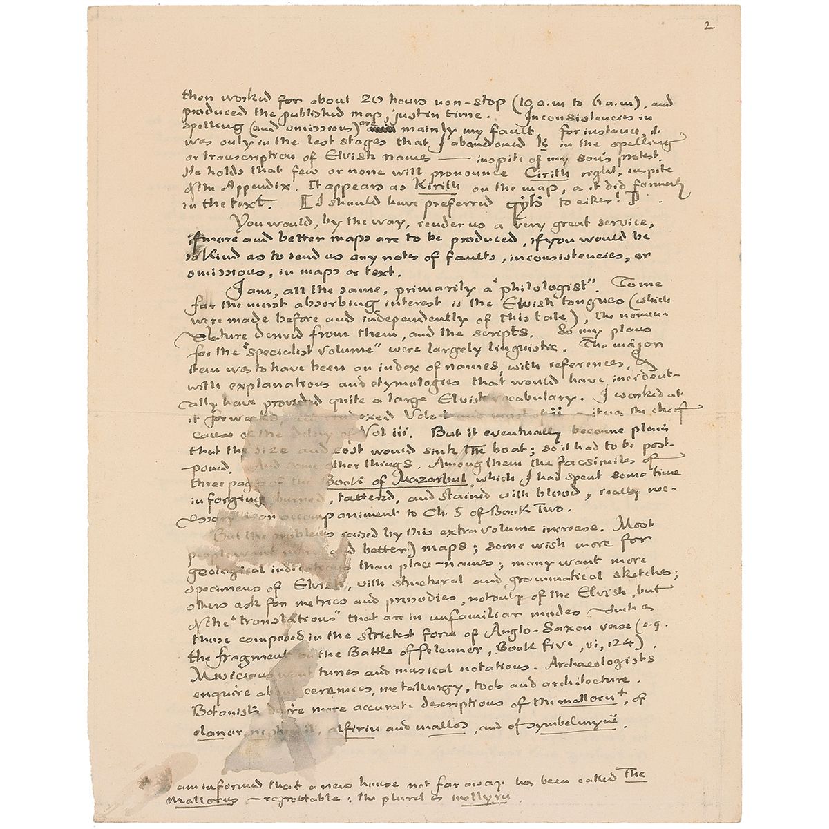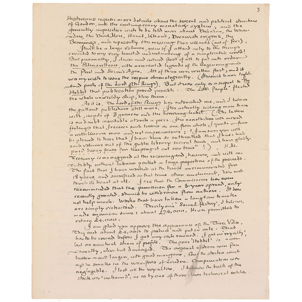 Written during the initial success of the first publications of The Lord of the Rings (but prior to their recouping the production cost of £4,000, which “has to be covered before I get any cash reward,” according to the author), this extraordinary letter holds a wealth of insight into the world of the Rings. In discussing the financial constraints of the project, and the “volume of material for ‘specialists’” that he had planned to create—“a large volume, even if I attend only to the things revealed to my very limited understanding of a complicated world!”—he delves in to such topics as the nuances of the Elvish language, the need for a more thorough explanation of the origins of Middle-Earth’s residents and place-names, and the ceaseless requests from his new audience, eager for more information on his world: musicians requesting tunes, archaeologist enquiring about metallurgy and architecture, botanists seeking information about the plant-life, historians interesting in the politics of Gondor, etc. An absolutely astonishing letter from the creator of the most famous fantasy world in all of literature, revealing the all-consuming effect that it had—and continues to have—on fans around the world. Written in his stunning calligraphic hand, this lengthy letter is one of the finest known to exist, both in content and appearance, indulging in the details of the Rings that captured the imaginations of millions.