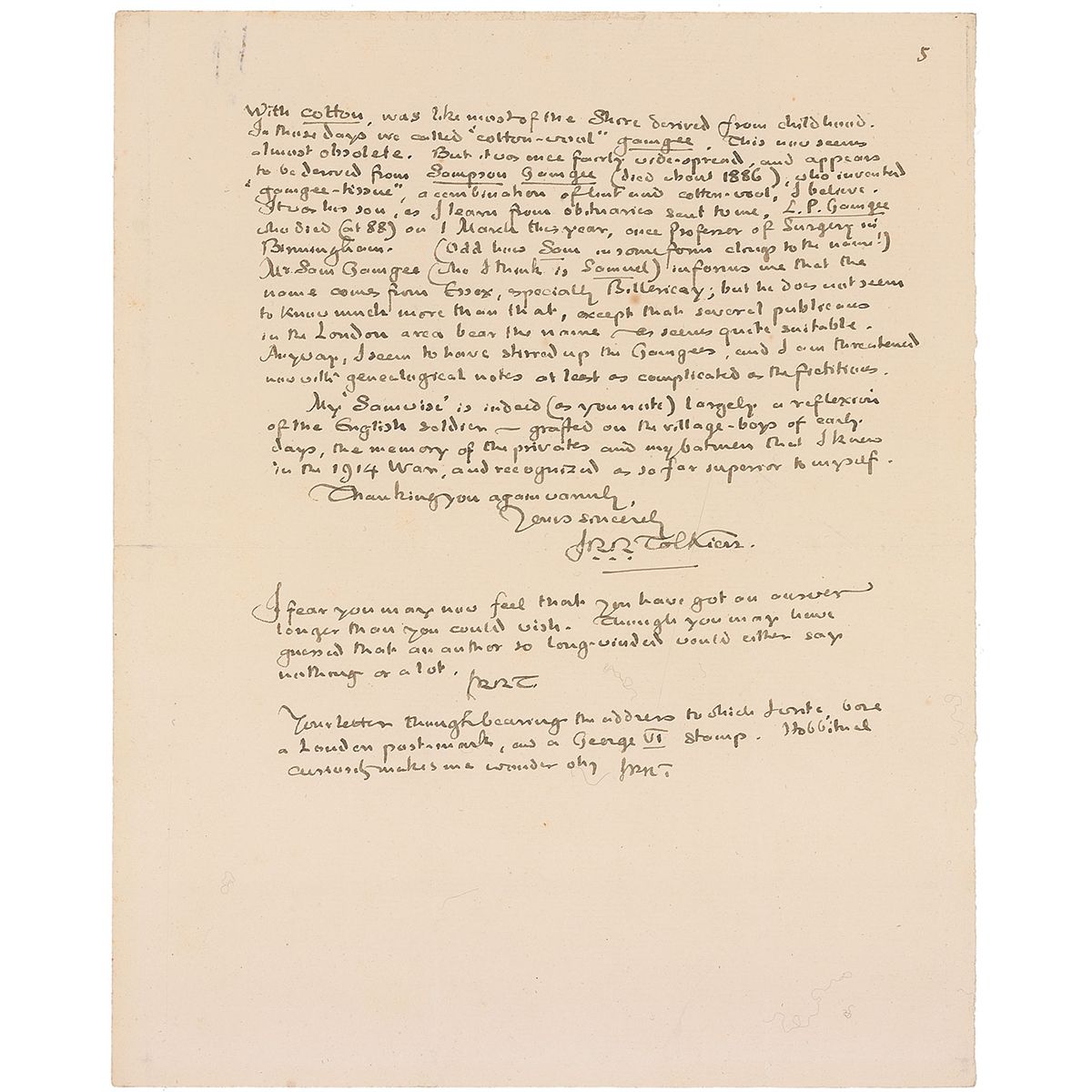 Tolkien also adds two handwritten postscripts, both signed “J.R.R.T.” The first reads: “I fear you may now feel that you have gotten an answer longer than you could wish. Though you may have guessed that an author so long-winded would either say nothing or a lot.” The second is a comment on the postmark and stamp.