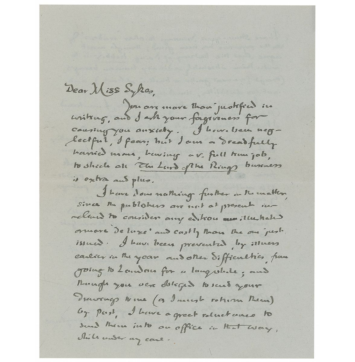 ALS, in his distinctive calligraphic hand, two pages, both sides, personal letterhead, no date, but circa July 1956. Letter to to Doris Sykes, discussing her illustrations inspired by The Lord of the Rings. In part: “I have done nothing further in the matter, since the publishers are not at present inclined to consider any edition illustrated or more deluxe and costly than the one just issued…I have shown your drawings to other ‘readers’ & the response has been good; though most agree that the best way of doing hobbits is to make them absolutely ordinary human beings (except for a neat goatee or buskin of hair), and not too childlike, round-eyed etc. I cannot remember what notes I mentioned (having no secretary, I have no copies, unless I type). But I think what you need is a copy of the book. I am sorry that I have nothing left (save my own copy!); but I will if you like send some copies that would do to work from.