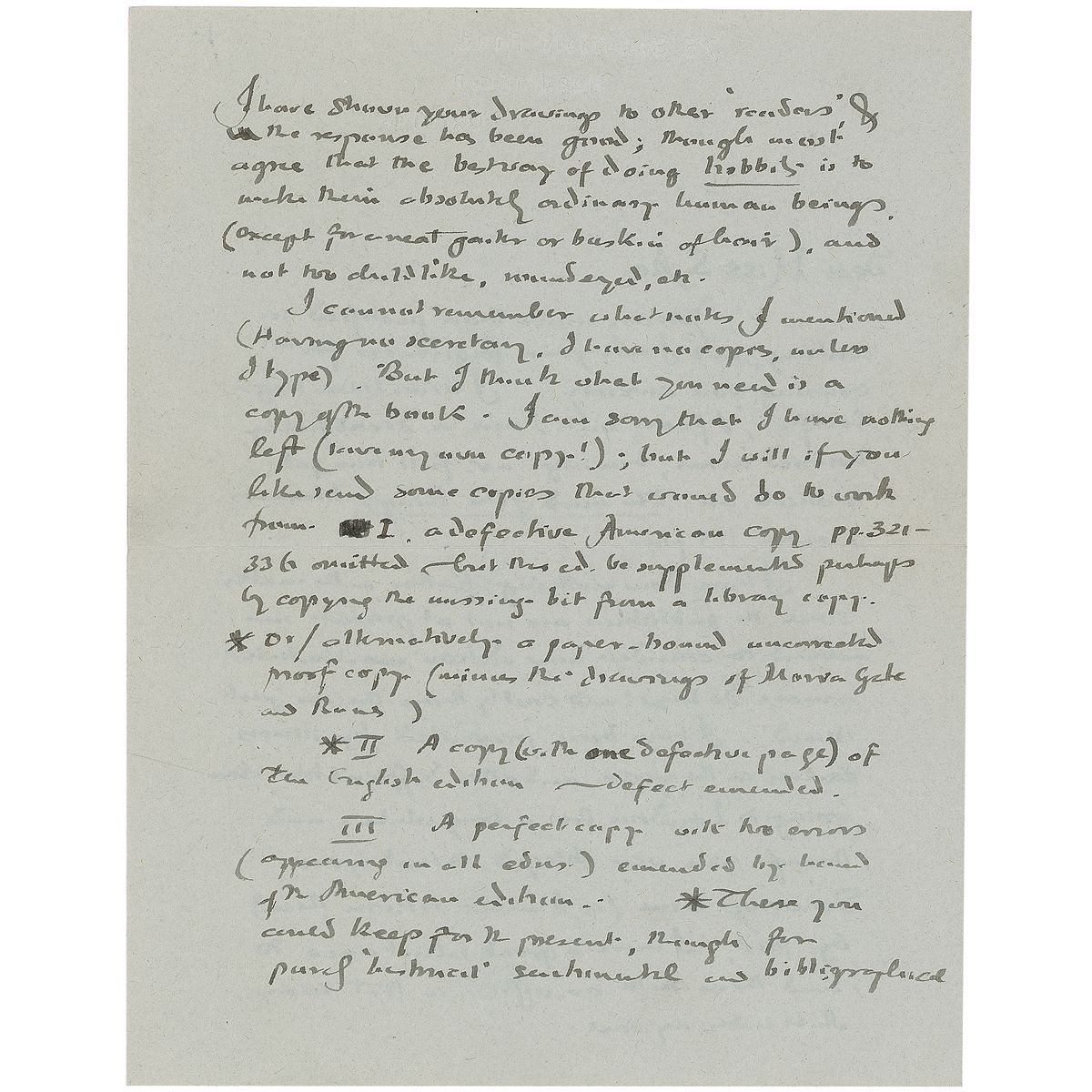 Started as a single sentence, ‘In a hole in the ground there lived a hobbit,’ written while correcting papers in the early 1930s, Tolkien’s novel The Hobbit introduced the world to Middle Earth. The publishers had originally planned to have just two maps printed on the endpapers, however, they were so charmed with the author’s illustrations that they included all twelve. The first American edition of The Hobbit would be even more enhanced with the addition of color plates, again designed by the author. Despite the enormous popularity of his book, Tolkien was still seeking to reap the financial rewards, as he notes in his postscript, “if and when I get any money from the book”—The Hobbit and The Lord of the Rings were published under a 'profit-sharing' arrangement in which he would not receive an advance or royalties until the books had broken even. A scarce and beautifully scripted handwritten offering, with a rare and direct reference to his most famous of Middle Earth residents.