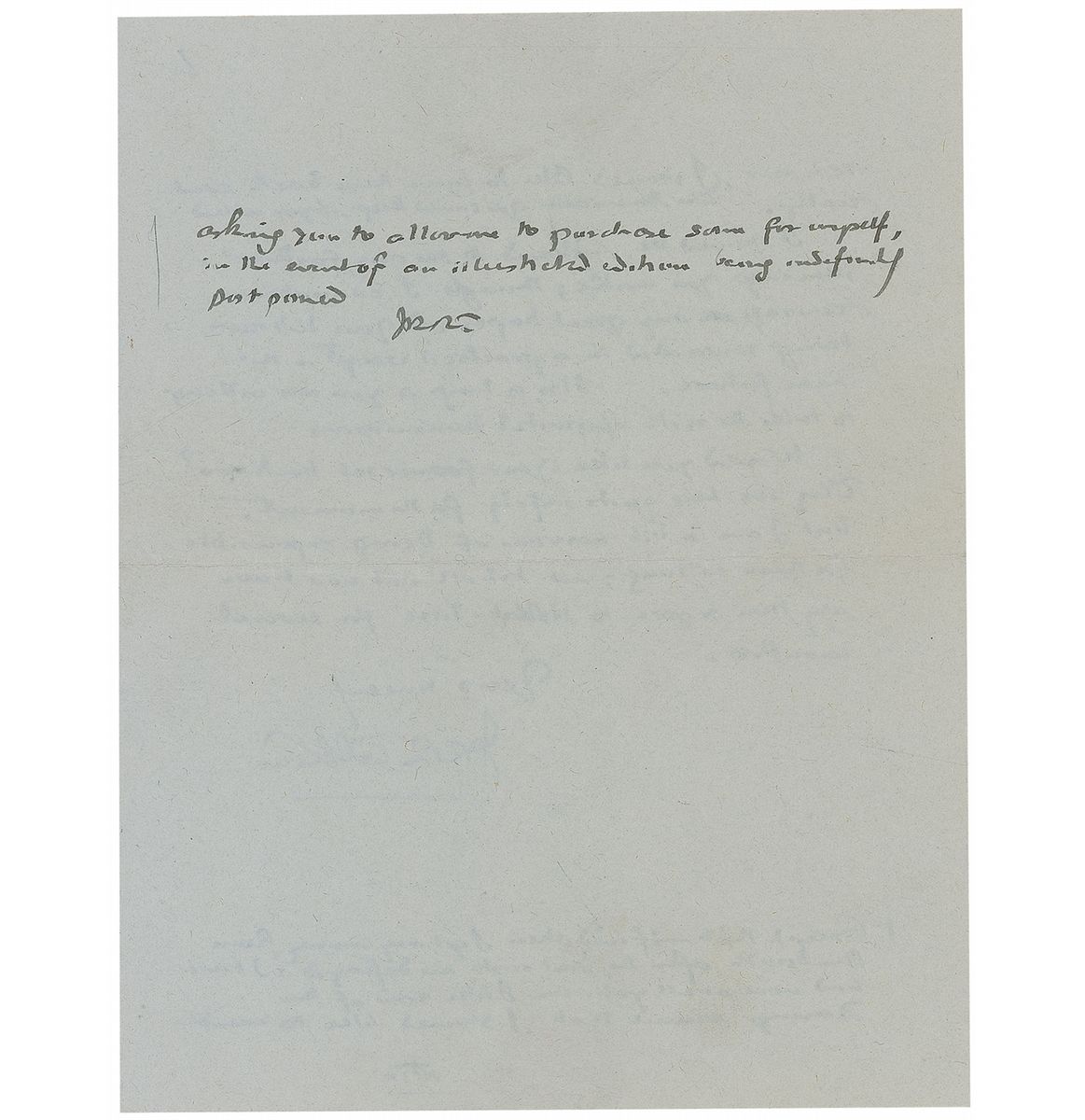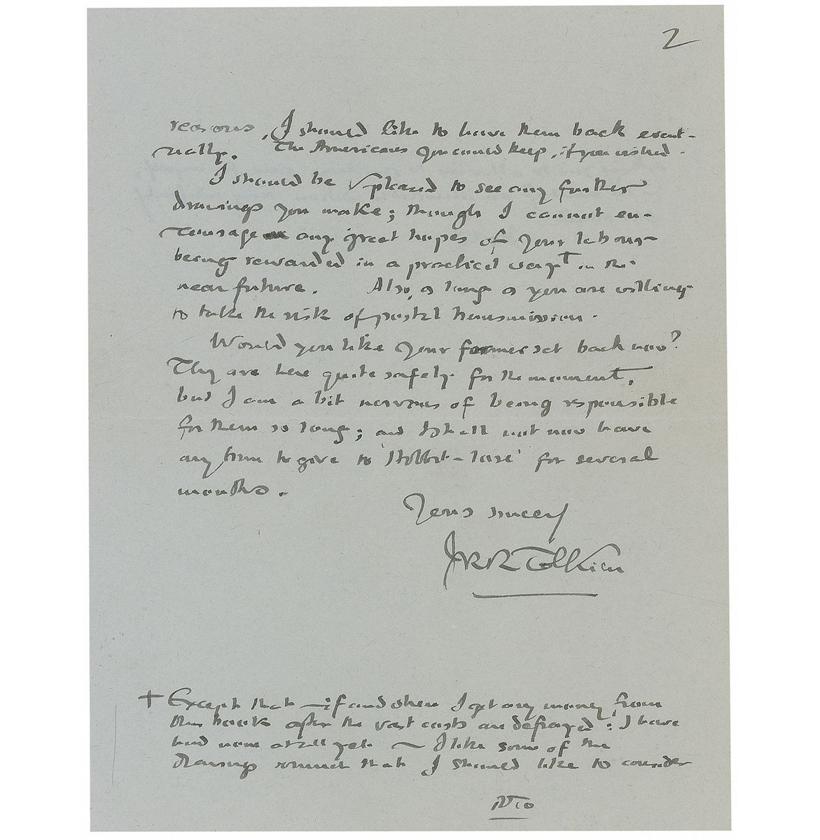I should be v. pleased to see any further drawings you make; though I cannot encourage any great hopes of your labour being rewarded in a practical way in the near future.” Under his his signature, Tolkien adds a handwritten postscript, signed with his initials, which reads: “Except that—if and when I get any money from the book after the vast costs are defrayed: I have had none at all yet—I like some of the drawings so much that I should like to consider asking you to allow me to purchase some for myself, in the event of an illustrated edition being indefinitely postponed.” In fine condition.