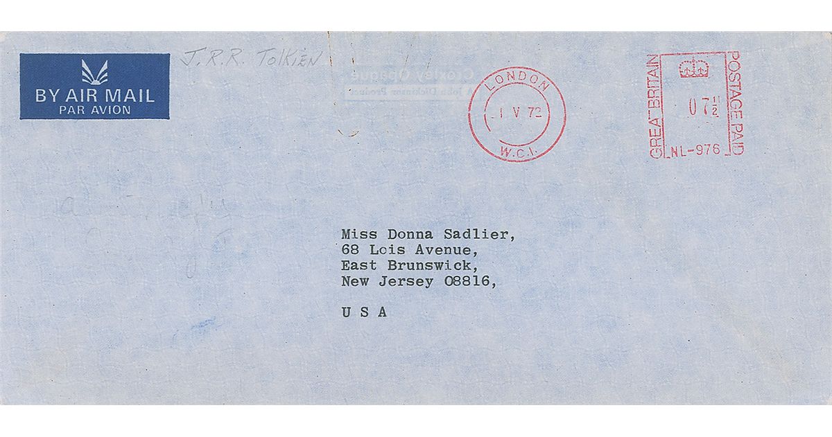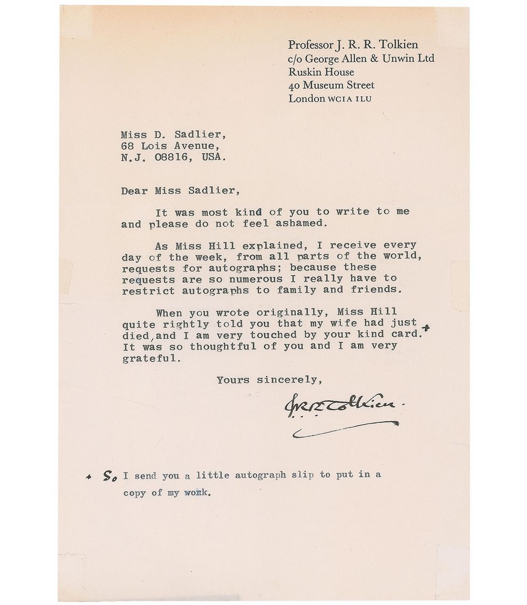 TLS, one page, 6 x 9, personal letterhead, no date but postmarked May 1, 1972. Letter to Miss Donna Sadlier. In full: “It was most kind of you to write to me and please do not feel ashamed. As Miss Hall explained, I receive every day of the week, from all parts of the world, requests for autographs; because these requests are so numerous I really have to restrict autographs to family and friends. When you wrote originally, Miss Hill quite rightly told you that my wife had just died, and I am very touched by your kind card. It was so thoughtful of you and I am very grateful.” Tolkien adds a brief postscript, hand writing the first word: “So I send you a little autograph slip to put in a copy of my work.” A horizontal fold passing through the signature, toning to the top, a tiny edge tear and piece of tape to the left edge, and surface loss and small tears to corners from mounting, otherwise fine condition. Accompanied by the original mailing envelope. Tolkien’s wife Edith, who had served as the inspiration for the elvish character Luthien in the Lord of the Rings trilogy, had passed away in November 1971.