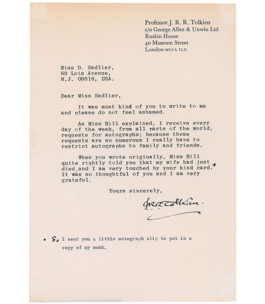 TLS, one page, 6 x 9, personal letterhead, no date but postmarked May 1, 1972. Letter to Miss Donna Sadlier, in full: “It was most kind of you to write to me and please do not feel ashamed. As Miss Hall explained, I receive every day of the week, from all parts of the world, requests for autographs; because these requests are so numerous I really have to restrict autographs to family and friends. When you wrote originally, Miss Hill quite rightly told you that my wife had just died, and I am very touched by your kind card. It was so thoughtful of you and I am very grateful.” Tolkien adds a brief postscript, hand writing the first word: “So I send you a little autograph slip to put in a copy of my work.” A horizontal fold passing through the signature, toning to the top, a tiny edge tear and piece of tape to the left edge, and surface loss and small tears to corners from mounting, otherwise fine condition. Accompanied by the original mailing envelope. Tolkien’s wife Edith, who had served as the inspiration for the elvish character Luthien in the Lord of the Rings trilogy, had passed away in November 1971.