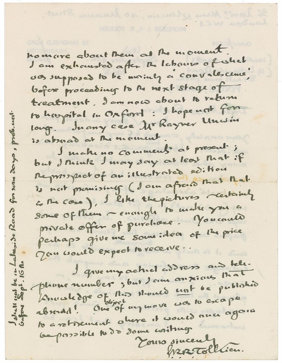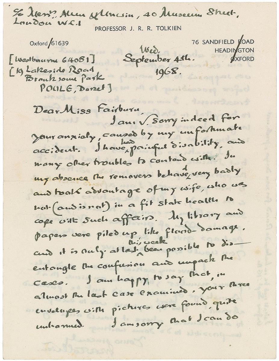 ALS, one page both sides, 5.25 x 7, personal Oxford letterhead, September 4, 1968. Letter to Mary Fairburn, an artist who sent him paintings of several scenes from Lord of the Rings. In part: “I am sorry indeed for your anxiety, caused by my accident. I have had painful disability, and many other troubles to contend with. In my absence the removers behaved very badly and took advantage of my wife, who was not (and is not) in a fit state of health to cope with such affairs. My library and papers were piled up like flood-damage, and it is only at last this week been possible to disentangle the confusion and unpack the cases. I am happy to say that, in almost the last case examined, your three envelopes with pictures were found, quite unharmed. I am sorry that I can do no more about them at the moment. I am exhausted after the labour of what was supposed to be mainly a ‘convalescence,’ before proceeding to the next stage of treatment. I am now about to return to hospital in Oxford: I hope not for long. In any case Mr. Rayner Unwin is abroad at the moment. I make no comments at present; but I think I may say at least that if the prospect of an illustrated edition is not promising (I am afraid that that is the case), I like the pictures—certainly some of them—enough to make you a private offer of purchase. You could perhaps give me some idea of the price you would expect to receive. I give my actual address and telephone number; but I am anxious that knowledge of this should not be published abroad! One object of my move was to escape to a retirement where it would once again be possible to do some writing.” In fine condition.