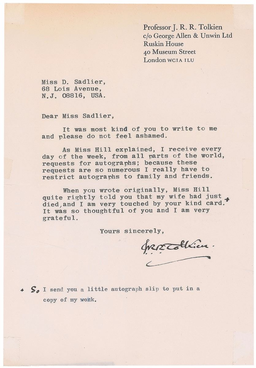 TLS, one page, 6 x 9, personal letterhead, no date but postmarked May 1, 1972. Letter to Miss Donna Sadlier, in full: “It was most kind of you to write to me and please do not feel ashamed. As Miss Hall explained, I receive every day of the week, from all parts of the world, requests for autographs; because these requests are so numerous I really have to restrict autographs to family and friends. When you wrote originally, Miss Hill quite rightly told you that my wife had just died, and I am very touched by your kind card. It was so thoughtful of you and I am very grateful.” Tolkien adds a brief postscript, hand writing the first word: “So I send you a little autograph slip to put in a copy of my work.” A horizontal fold passing through the signature, toning to the top, a tiny edge tear and piece of tape to the left edge, and surface loss and small tears to corners from mounting, otherwise fine condition. Accompanied by the original mailing envelope. Tolkien’s wife Edith, who had served as the inspiration for the elvish character Luthien in the Lord of the Rings trilogy, had passed away in November 1971.