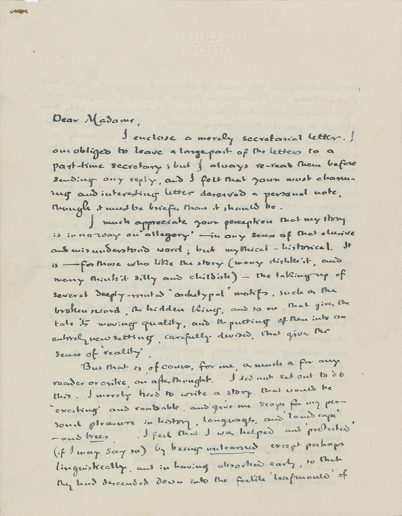 The ALS, two pages both sides, 7 x 9, blindstamped personal letterhead, [December 16, 1963], in part: "I much appreciate your perception that my story is in no way an 'allegory'—in any sense of that elusive and misunderstood word; but mythical-historical. It is—for those who like the story (many dislike it, and many think it silly and childish)—the taking up of several deeply-rooted 'archetypal' motifs, such as the broken sword, the hidden King, and so on, that gives the tale its moving quality, and the putting of them into an entirely new setting, carefully devised, that gives the sense of 'reality.'