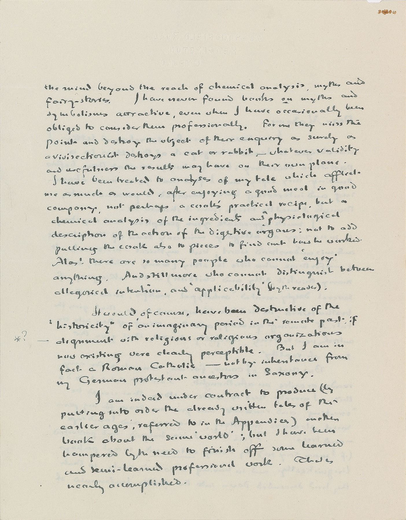 But that is, of course, for me, as much as for any reader or critic, an afterthought. I did not set out to do this. I merely tried to write a story that would be 'exciting' and readable, and give me a scope for my personal pleasure in history, languages, and 'landscape'—and trees. I feel that I was helped and 'protected' (if I may say so) by being unlearned except perhaps linguistically, and in having absorbed early, so that they had descended down into the fertile 'leafmould' of the mind beyond the reach of chemical analysis, myths and fairy-stories. I have never found books on myths and symbolisms attractive, even when I have occasionally been obliged to consider them professionally. For me they miss the point and destroy the object of their enquiry as surely as a vivisectionist destroys a cat or rabbit—whatever validity and usefulness the result may have on their own plane. I have been treated to analyses of my tale which affect me as much as would, after enjoying a good meal in good company, not perhaps a cook's practical recipe, but a chemical analysis of the ingredients and physiological descriptions of the action of the digestive organs: not to add pulling the cook also to pieces to find out how he worked. Alas! there are so many people cannot 'enjoy' anything. And still more who cannot distinguish between allegorical intention, and 'applicability' (by the reader).