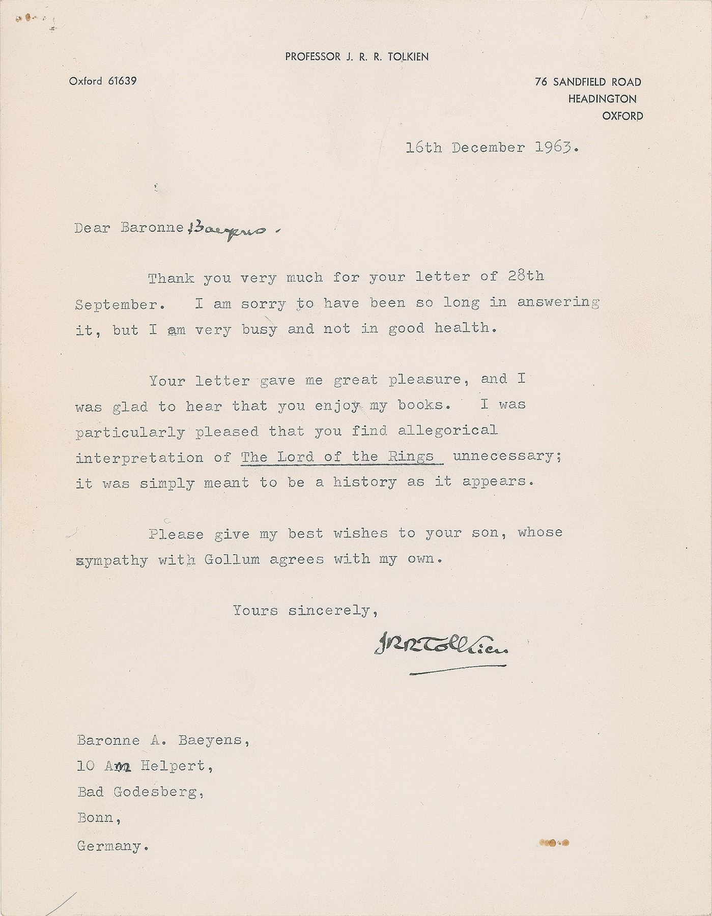 The TLS, one page, 7 x 9, personal letterhead, December 16, 1963, in part: "Your letter gave me great pleasure, and I was glad to hear that you enjoy my books. I was particularly pleased that you find allegorical interpretation of The Lord of the Rings unnecessary; it was simply meant to be a history as it appears." In overall fine condition, with small rust stains to the upper left corners. An absolutely remarkable pairing of letters from Tolkien, offering a deep and thoughtful discussion of his own work, as well as details on his organic process of formulating characters; these are among the most insightful and important Tolkien letters we have encountered.