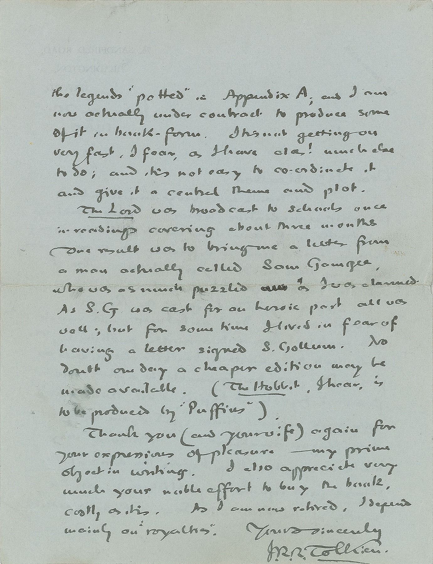 The Lord was broadcast to schools once in readings covering about three months—one result was to bring me a letter from a man actually called Sam Gamgee, who was as much puzzled as I was alarmed. As S. G. was cast for an heroic part all was well, but for some time I lived in fear of having a letter signed S. Gollum. No doubt one day a cheaper edition may be made available (The Hobbit, I hear, is to be produced by 'Puffins'). Thank you (and your wife) again for your expressions of pleasure—my prime object in writing. I also appreciate very much your noble effort to buy the book, costly as it is. As I am now retired, I depend mainly on royalties." In fine condition. Accompanied by the original mailing envelope addressed in Tolkien's hand.