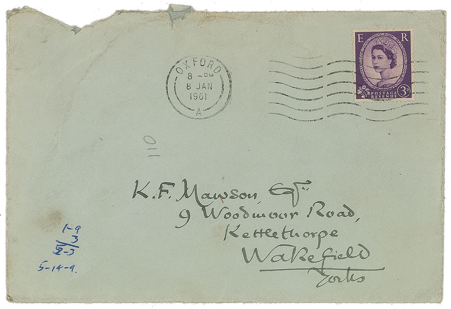 ALS, one page both sides, 5.25 x 7, personal letterhead, January 7, 1960. Letter to K. F. Mawson in Wakefield, in full: "Thank you very much indeed for your appreciative letter. Your reading, and the tastes in it, seem very much like my own; though I now find it difficult to come across anything that holds my attention. Also I seldom read anything twice! Certainly 'The Lord of the Rings' required a great deal of labour; and much of the material wasn't actually published. The book had to be written backwards as well as forwards and being unable to afford professional typists, I typed it all twice and some parts several times; and I am only a two-finger amateur. However, very much was written long before the Lord of the Rings (and refused by publishers): all the matter of the First and Second Ages, especially the legends 'potted' in Appendix A, and I am now actually under contract to produce some of it in book-form. It is not getting on very fast, I fear, as I have alas! much else to do; and it is not easy to co-ordinate it and give it a central theme and plot.