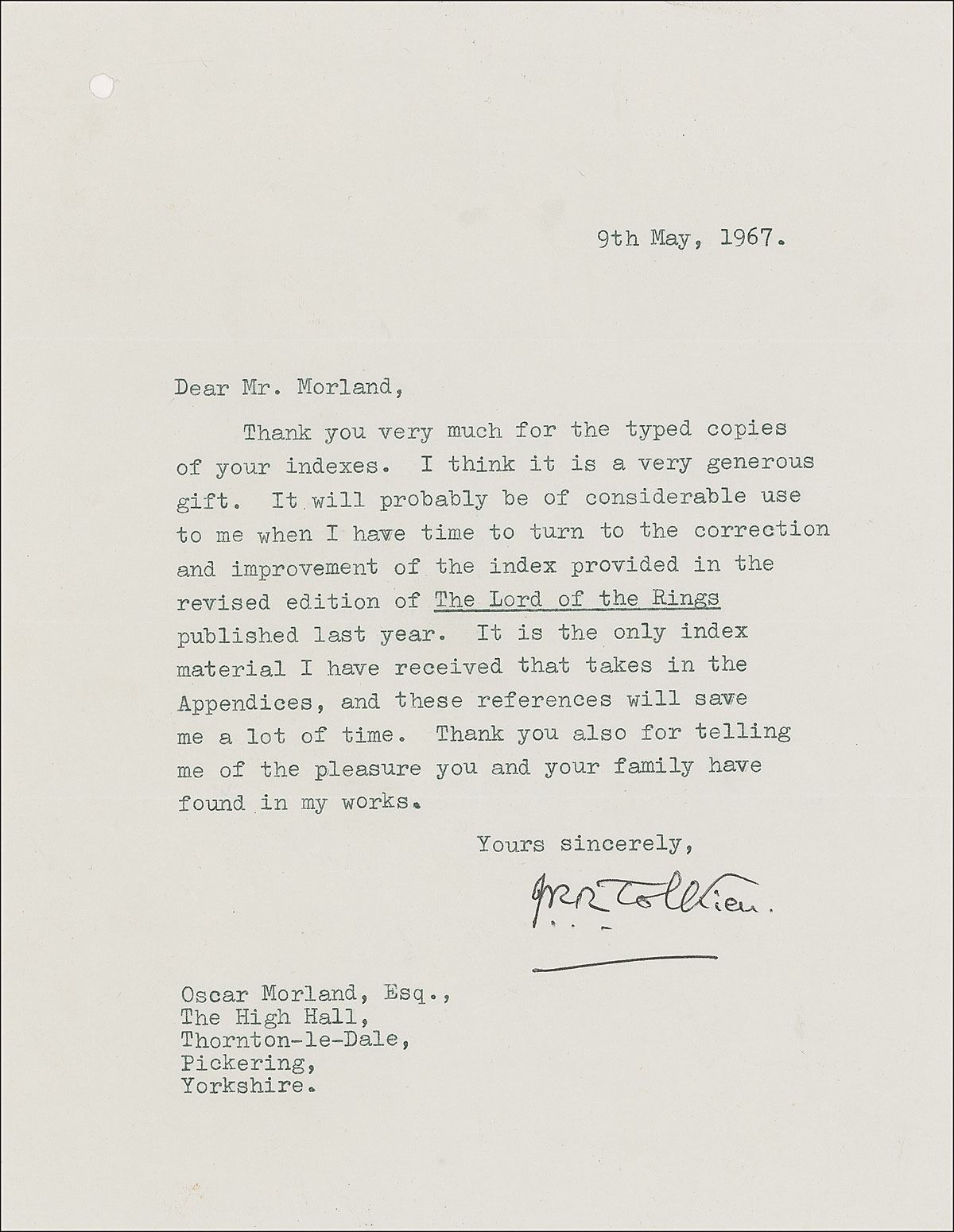 TLS, one page, 7 x 9, personal letterhead, May 9, 1967. Letter of thanks to British Ambassador Oscar Morland at The High Hall. In full: "Thank you very much for the typed copies of your indexes. I think it is a very generous gift. It will probably be of considerable use to me when I have time to turn to the correction and improvement of the index provided in the revised edition of The Lord of the Rings published last year. It is the only index material I have received that takes in the Appendices, and these references will save me a lot of time. Thank you also for telling me of the pleasure you and your family have found in my works." In fine condition, with intersecting folds, a file hole to top left, and scattered light creasing. This revised edition was a direct result of the Ace Books debacle, when editor Donald A. Wollheim published an unauthorized edition after discovering that Houghton Mifflin had neglected to copyright the first one. After a passionate upheaval from a legion of devoted fans, Ace Books withdrew the edition, and Tolkien published a revised and irrefutably copyrighted second edition in 1965.