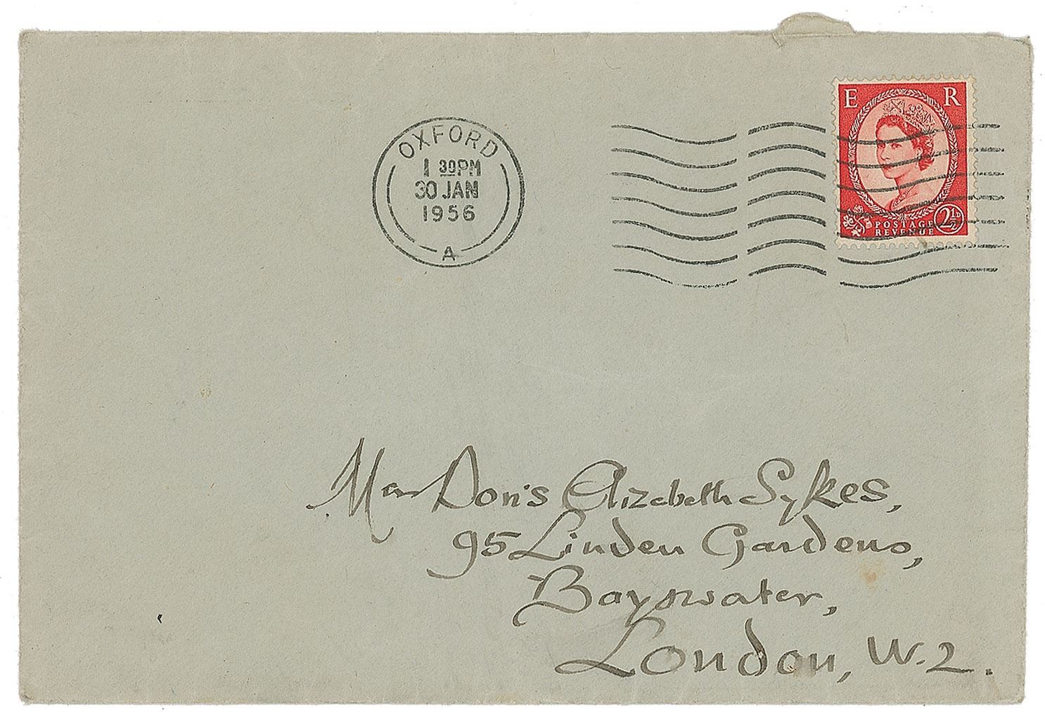 Hand-addressed mailing envelope, 5.5 x 3.75, addressed in Tolkien's hand to "Mrs. Doris Elizabeth Sykes, 95 Linden Gardens, Bayswater, London, W2." Envelope bears a January 30, 1956, Oxford postmark. In fine condition, with light creases and tears to the flap from opening. Tolkien corresponded with Sykes a few times, and he praised illustrations she sent him that had been inspired by Lord of the Rings.